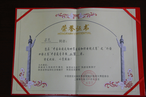 11月18日,中国・西安走向世界出国知识电视大赛组委会向我院发来喜报,我院英语802班学生马兰在此次外语口语电视大赛中获得三等奖,英语702班学生种莹、英语602班学生吴林姣两名同学获得优胜奖,以表祝贺。