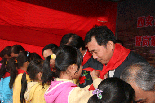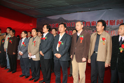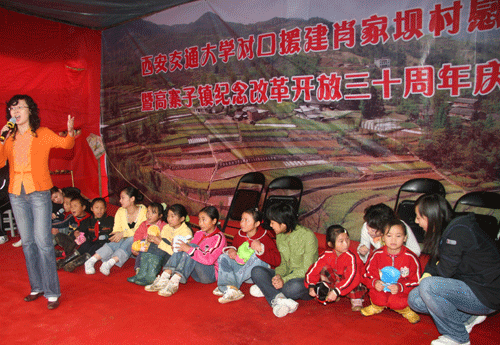 尽管当天细雨蒙蒙,但自发组织参加活动的村民热情丝毫未减。在村子里搭建的简易舞台上,西安交通大学及高寨子镇部分领导发表了热情洋溢的动员讲话,陕西省宁强县作为此次5月12日特大地震的重灾区,他们希望村民能够尽快树立起灾后重建家园的信心,并表示此项帮扶活动会一直持续下去,将在财物、文化、医疗等各方面为肖家坝村带来最有效最实惠的帮助,现场掌声雷动。此时,肖家坝村的小学生们心怀感恩之心,为出席此次活动的领导们敬献红领巾,场面令人感动。尔后,由西安交通大学艺术团的师生为村民献上了一台精彩的文艺汇演。