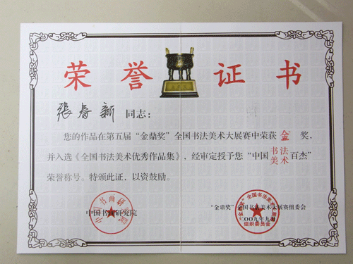 我院艺术设计系张春新老师,于今年9月在由中国书画研究院主办的第五届“金鼎奖”全国书法、美术大赛中荣获“金奖”,并且,其作品入选《全国书法、美术优秀作品集》,授予“中国书法美术百杰”荣誉称号。