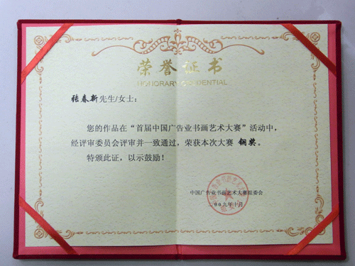 同年10月,张春新老师又在由中国广告协会、广西美术家协会联合举办的“首届中国广告业书画艺术大赛”中荣获“铜奖”。