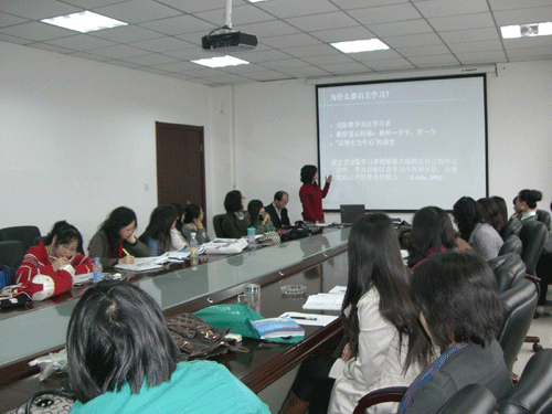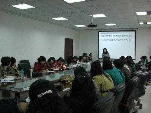 首先,韩红建老师对开学以来英语教学的运行情况进行了总结并就08和09级英语下半学期的教学管理和内容调整进行了总体安排。随后,解利群老师结合自身经验,就大学英语课程中每个单元的设计思路,语言点的选择和处理以及重点、难点的讲授进行了主旨发言。徐素云老师则就教师在学生泛读材料的阅读过程中如何充分调动学生自主学习能力做了详细阐述和讲解,对教师在学生自主学习过程中的作用进行了归纳和总结。参会的各位老师热烈积极地讨论了两位老师的发言,共享自己在教学中优良经验,并开诚布公的就自己在英语教学工作中遇到问题进行探讨,取长补短,相互学习。