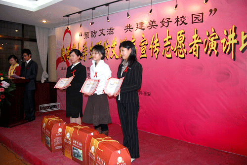 我院与西安交通大学、长安大学、西北大学、西安石油大学等高校的27名大学生预防爱滋病宣传志愿者参加了演讲。我院选手通过对爱滋病的预防、全球以及我国爱滋病发病情况、爱滋病患者的处境等问题的阐述,有效宣传了国家防治爱滋病政策和爱滋病防治知识,赢得了领导、嘉宾和台下观众的一致好评。