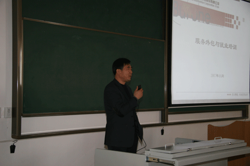 西安交大博通股份有限公司总工程师江开耀教授在培训动员大会上对软件服务外包产业作了深入浅出地介绍。软件服务外包是近年来新兴的一项科技智力密集、附加值大、资源消耗低、吸纳就业强、国际化水平高、投资少见效快的新兴产业。