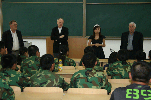 加拿大纽纷兰纪念大学代表团在学院访问期间,还在A100大教室与正在参加军训的已报名参加中加合作项目的我院同学进行了深入的交流,Axel Meisen校长、Gary Gorman院长、Michael Bums教授分别发表了精彩的演讲,并回答了同学们提出的有关赴加留学的种种问题。