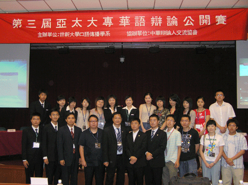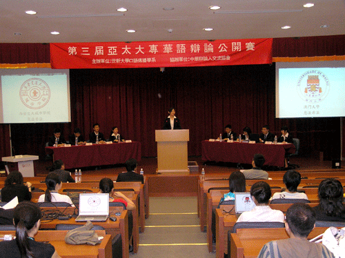 200778下午3时,第三届亚太华语大专辩论公开赛初赛第六场在台湾世新大学管理学院二楼国际报告厅拉开战幕。我院辩论队与实力强劲的澳门大学辩论队展开激烈的论辩,由黄执中、李欣晏和汪和宁等3名最佳辨士担任本场评判,我院辩论队以21的成绩取得本场比赛的胜利,昂首挺进8强。