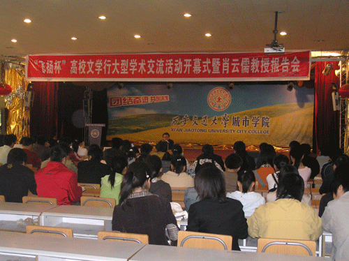 2007年4月8日上午10时,由我院百草园文学社主办的“飞扬杯”高校文学行大型学术交流活动开幕式暨肖云儒教授报告会在院学生活动中心隆重召开。本次大会很荣幸的请到了中国文联委员、中国文联理论批评委员会副主任、陕西文联专职副主席肖云儒教授,学院党总支副书记、副院长韩超老师、团委书记陈涛老师及西安地区9所兄弟院校各文学社的代表出席本次活动。