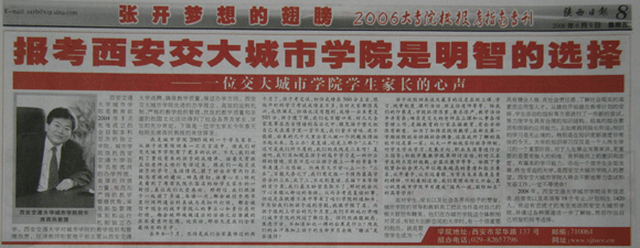 2006年6月9日,陕西日报第八版头条刊登了“报考西安交大城市学院是明智的选择――一位交大城市学院学生家长的心声”一文,全文如下: