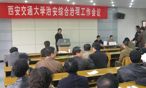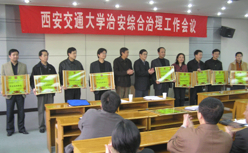 会议由校公安处董德民处长主持,校党委副书记李玉华教授宣读了《西安交通大学2005年度综合治理工作表彰决定》,党委副书记、副校长丘进教授做了重要讲话。丘进副校长要求各单位要高度重视综合治理工作,消除安全隐患和消防死角,踏踏实实地做好消防安全、信息通报和治安治理工作,确保教育教学的顺利展开。同时,丘进副校长代表校综治委与各单位签订了《2006年度校园治安综合治理目标责任书》。