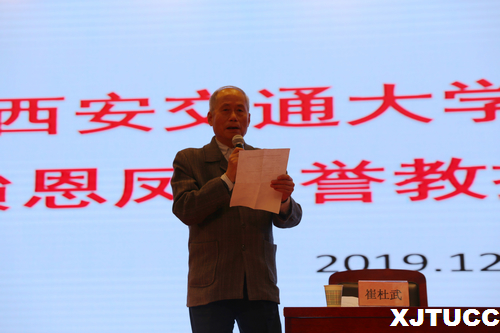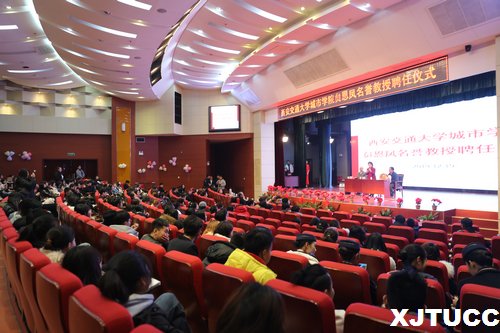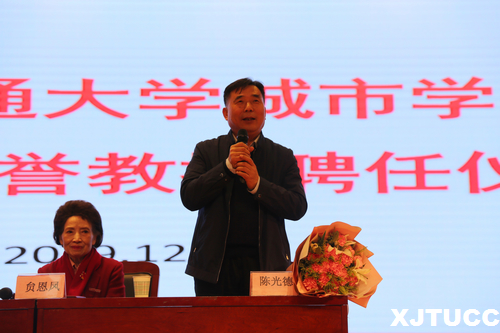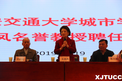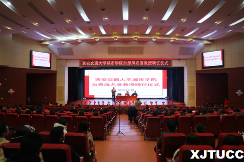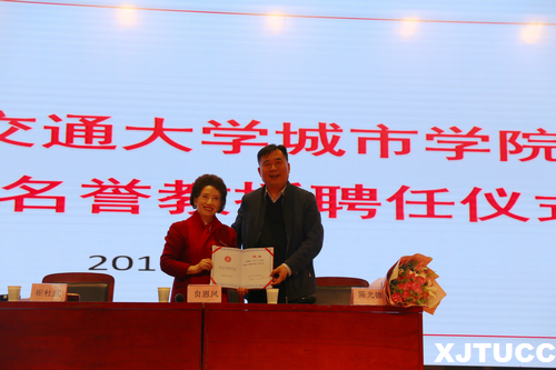 崔杜武副院长向现场师生介绍了贠恩凤教授的艺术成就和先进事迹。陈光德院长为贠恩凤教授颁发聘书、佩戴西安交通大学城市学院校徽并献花。