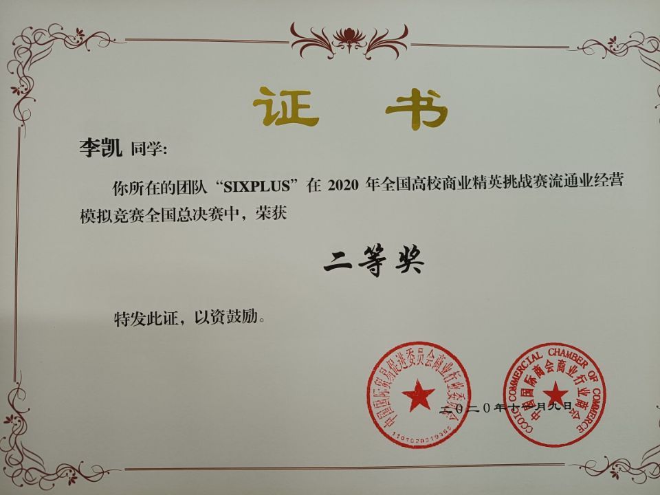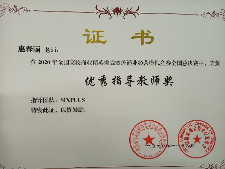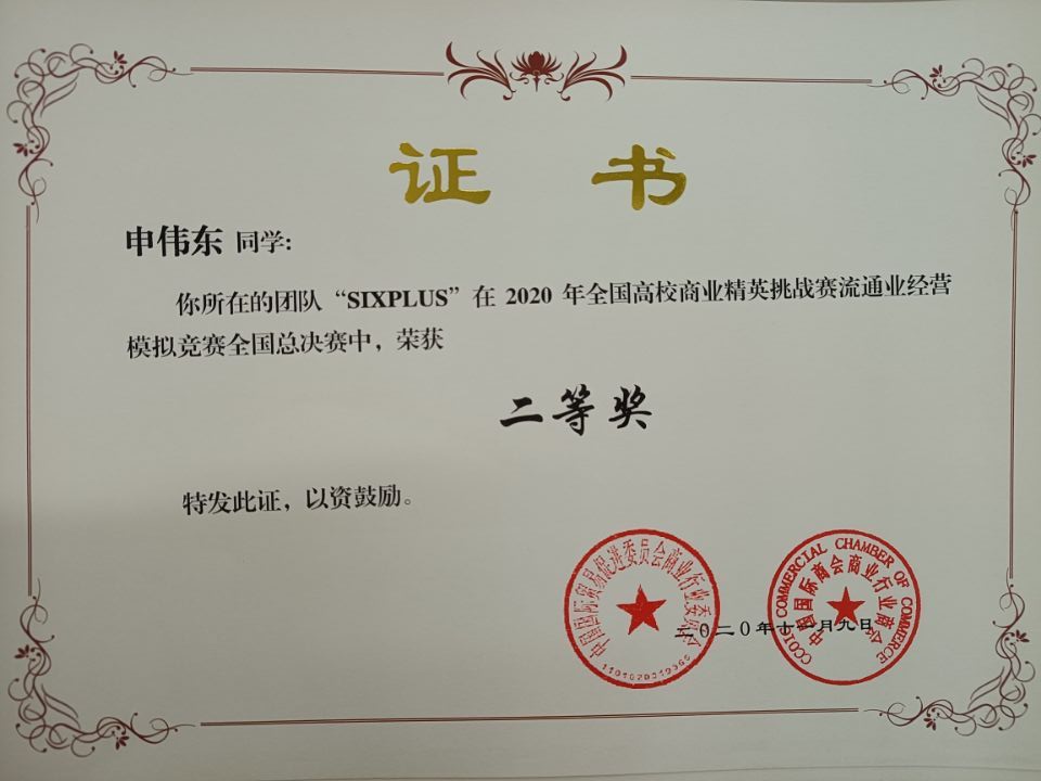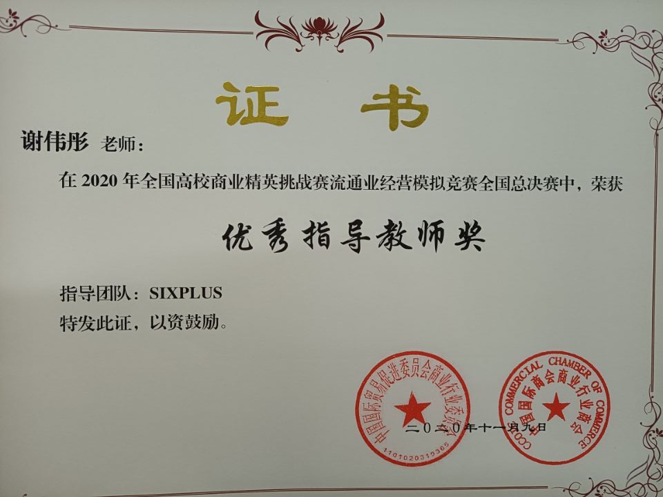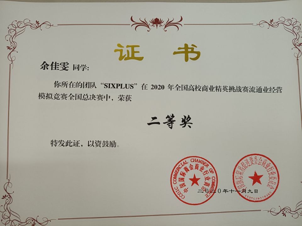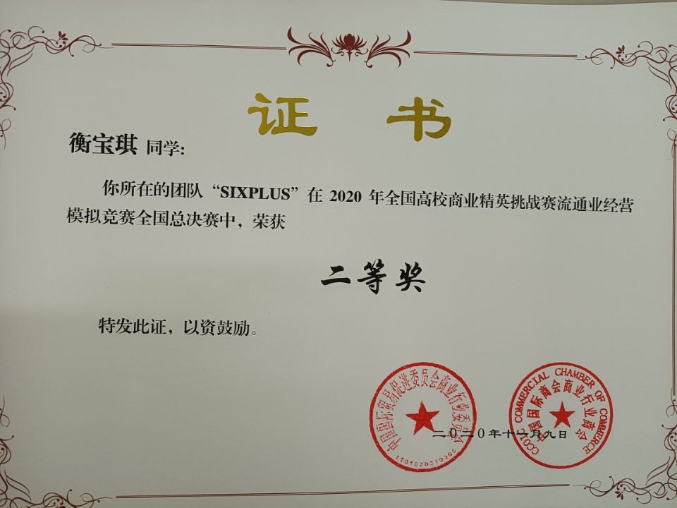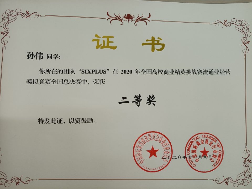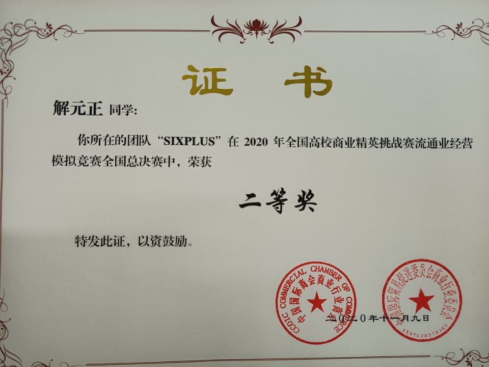 11月7日至8日,由中国国际商会商业行业商会和中国国际贸易促进委员会商业行业委员会共同主办,中国国际商会商业行业商会和南京特步软件有限公司承办的全国高校商业精英挑战赛流通业经营模拟竞赛全国总决赛圆满结束,我院管理系市场(专升本) 191孙伟、申伟东、李凯、衡宝琪,市场181谢元正,财管181余佳雯六位同学组成的“SIX PLUS”团队与全国高校的322队伍同台竞技,最终获得“全国二等奖”,惠春丽和谢伟彤两位老师获得“优秀指导老师奖”。