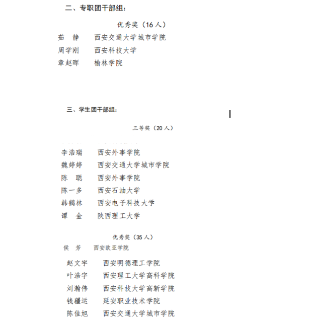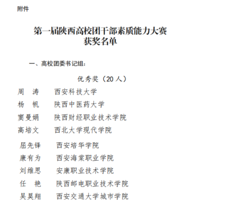 日前,共青团陕西省委、中共陕西省委教育工委联合发表了关于“第一届陕西高校团干部素质能力大赛”获奖情况。在此次活动中,我院获得喜人的成绩,团委书记吴昊翔荣获高校团委书记组优秀奖,团委茹静荣获专职团干部组优秀奖;魏婷婷同学荣获学生团干部组三等奖,陈佳旭同学荣获学生团干部组优秀奖。