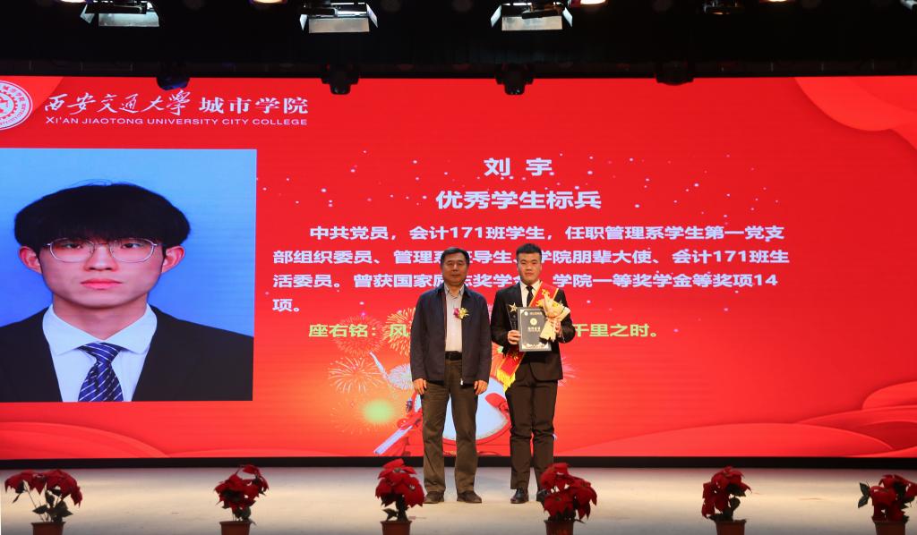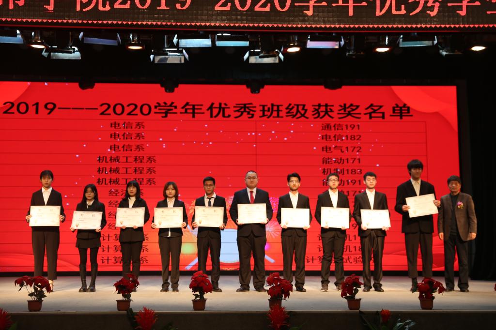 伴随着嘹亮的国歌声,表彰会正式拉开序幕。首先,党委书记张爱萍宣读了2019-2020学年优秀学生、先进集体的表彰决定,并宣布学院向翟宝怡等6名学生授予“优秀学生标兵”称号,向邢鲁鑫等4名同学授予“优秀学生标兵提名奖”称号,隆重表彰了刘宇等11国家奖学金获得者、李登等266名“国家励志奖学金”获得者,向周超等2330名学生授予“优秀学生奖”称号,向董文俊等3名学生颁发席酉民“创业与竞争力”新星奖。随后,与会领导分别为获奖个人和集体颁奖。
