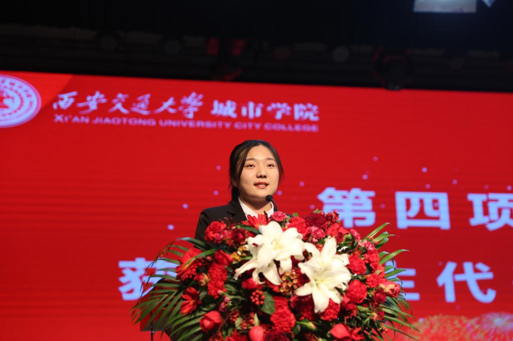 颁奖仪式后,国家奖学金获得者于珍妮作为优秀学生代表发言。他以“变得勇敢、有所准备、坚持不懈”为主题词与同学们分享了自己的大学生活和学习心得。通过三个小故事,号召同学们怀揣梦想,勇于追求;提醒同学们认识自己,把握当下;引导同学们知恩图报,对老师及家长心怀感恩。