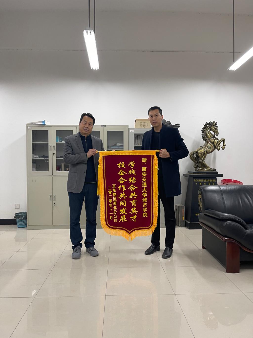 近日,京东物流西北分公司(简称京东西北区)人力资源经理白光泽先生莅临管理系,为管理系送上“学践结合共育英才,校企合作共同发展”锦旗一面,以表彰管理系物流管理专业实习生在本次京东西北区双十一大促集中实习中的优良表现。