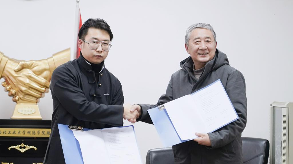 座谈会后,双方进行签字仪式。甲方代表良尔集团董事长魏思捷与乙方代表传播系常务副主任刘强在合同书上签字并合影留念。