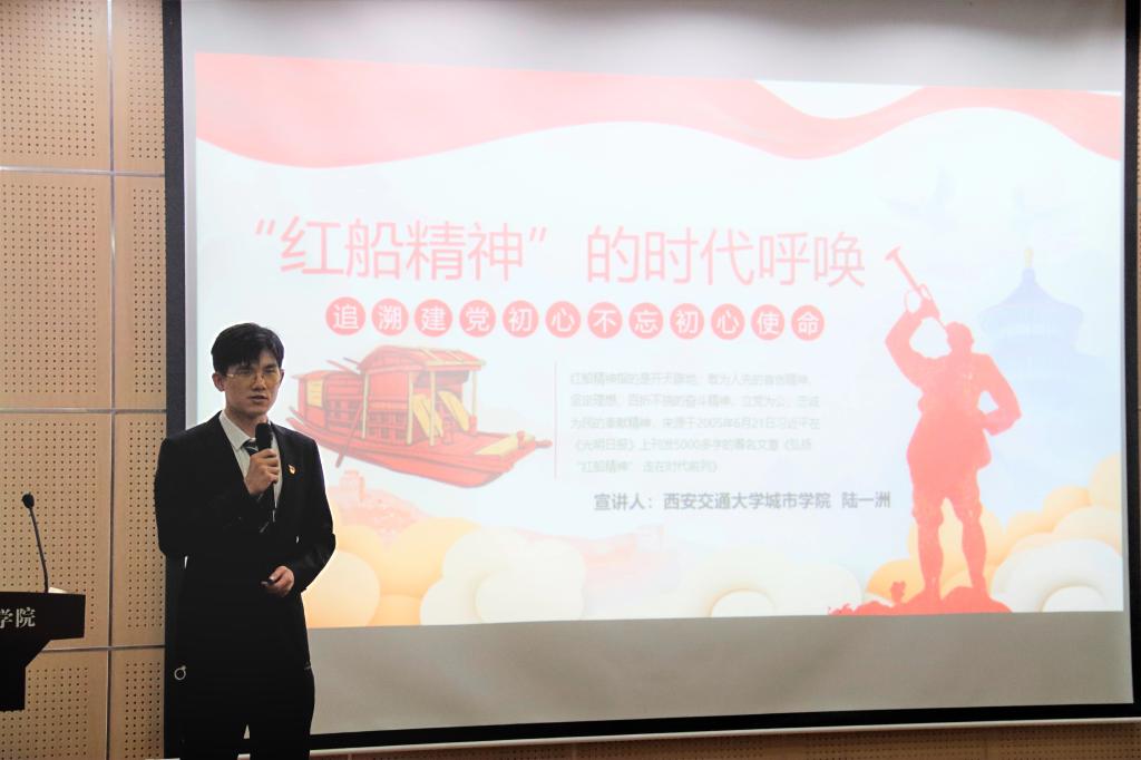 院学生会执行主席、中共党员、生在浙江嘉兴的陆一洲同学为大家宣讲了他心中的红船精神。他指出,开天辟地、敢为人先的首创精神,坚定理想、百折不挠的奋斗精神,立党为公、忠诚为民的奉献精神便是红船精神。土木191班班长关宁同学向我们讲述了我们共产党人刘启耀的一生,“腰缠万贯的讨米人”的故事诠释了共产党人对党的忠诚。他号召大家向刘启耀同志学习,做到“四个一”:一心一意,一以贯之,表里如一,知行合一,和“三个不”:不改齐心,不易其志,不毁其节。新时代沂蒙精神传承者刘洪江同学,用自己的故事向大家介绍了沂蒙精神,这是临沂人民支援革命战争的真实写照也是战火纷飞的革命时期孕育出来的伟大精神。随后,宣讲团的其他同学依次为大家讲述了西迁精神、“两弹一星”精神、北大荒精神、伟大抗疫精神等,它们共同形成了中国共产党人的精神谱系,并在中华民族的精神脊梁中注入了新的元素。