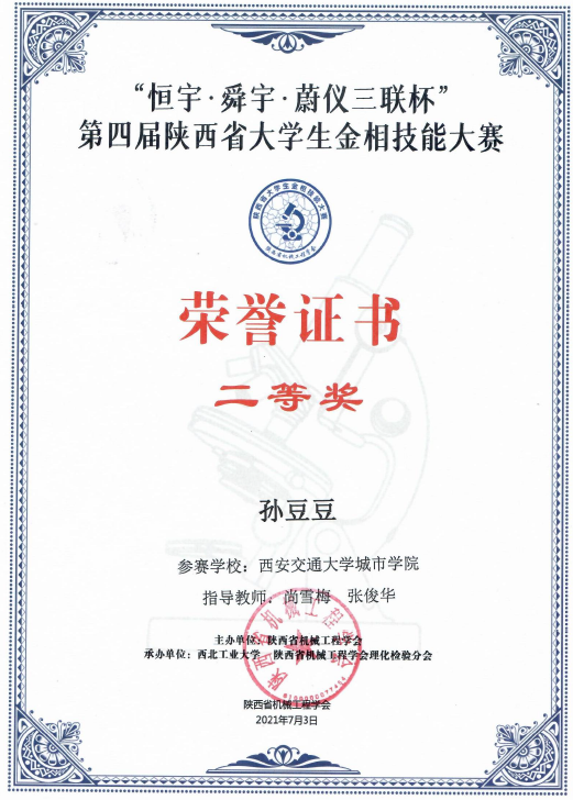 西安交通大学城市学院机械工程系首次组织并筹备参加本届大赛,在指导教师尚雪梅和张俊华的带领下,历经校内预选赛、复赛、决赛三个阶段,最终选出刘雨薇、沙世康、王乐、孙豆豆和杜怡佳5位同学代表城市学院参加金相技能大赛省赛。经过激烈的比拼,孙豆豆同学获省级二等奖。