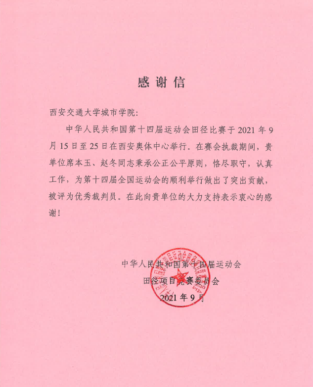 近日,西安交大城市学院收到第十四届全国运动会田径项目竞赛委员会发来的感谢信。赛委会在信中对我院席本玉、赵冬两位同志在田径项目赛会执裁期间的工作给与了高度肯定,对学院大力配合赛会工作表示衷心的感谢。据悉,席本玉、赵冬两位同志秉承公正公平原则,恪尽职守、认真工作,在十四届运动会中被评为优秀裁判员。