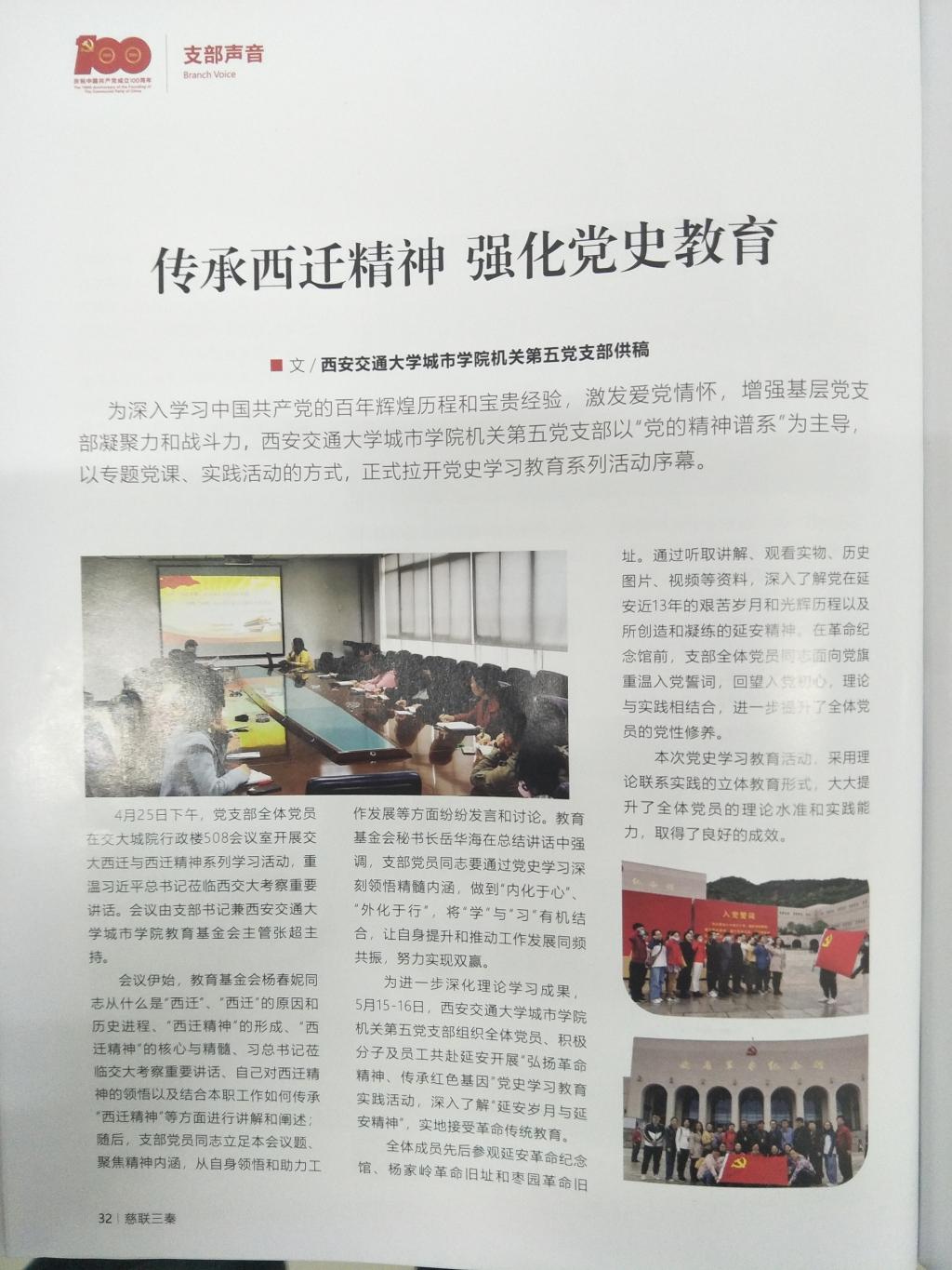 近日,学院机关第五党支部收到《慈联三秦》2021年第二期期刊,支部党史学习教育入选其中,题目为《传承西迁精神、强化党史教育》。