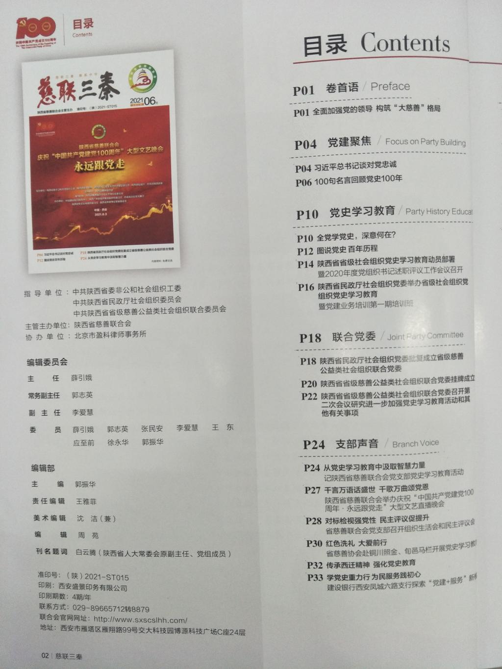 据悉,《慈联三秦》以中共陕西省委非公和社会组织工委、中共陕西省民政厅社会组织委员会、中共陕西省省级慈善公益类社会组织联合委员会为指导,陕西省慈善联合会主管主办的省级慈善公益类社会组织党建刊物,是省级慈善公益类社会组织党建工作指导和宣传的主阵地。