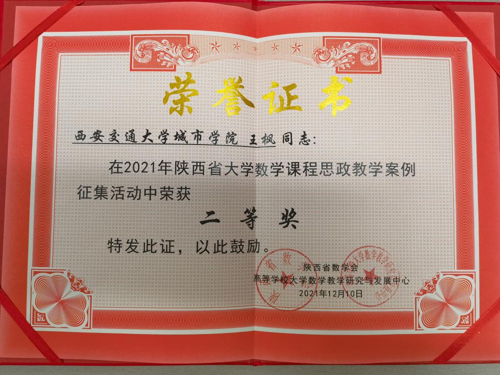 为了更好地激发和提升教师课程思政的能力,近期,陕西省数学会、大学数学教学委员会、高等学校大学数学教学研究与发展中心联合举办了2021年陕西省大学数学课程思政教学案例征集活动。西安交通大学城市学院数学教学部经前期广泛动员,各课程组在本次案例征集活动中精心准备,积极参与,最终王枫老师获二等奖。