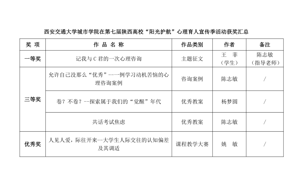 为培育大学生自尊自信、理性平和、阳光向上的积极心态,西安交通大学城市学院认真落实省委教育工委办公室《关于开展第七届陕西高校“阳光护航”心理育人宣传季实践活动的通知》文件精神,开展了系列心理实践活动,同时积极组织师生参加各类评比活动,并且取得佳绩。