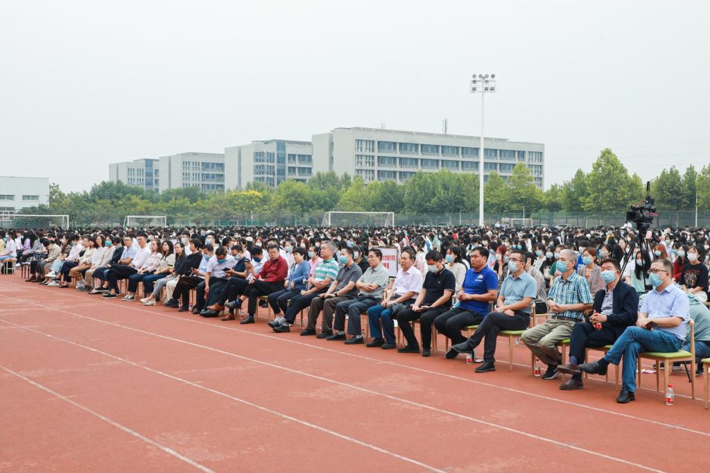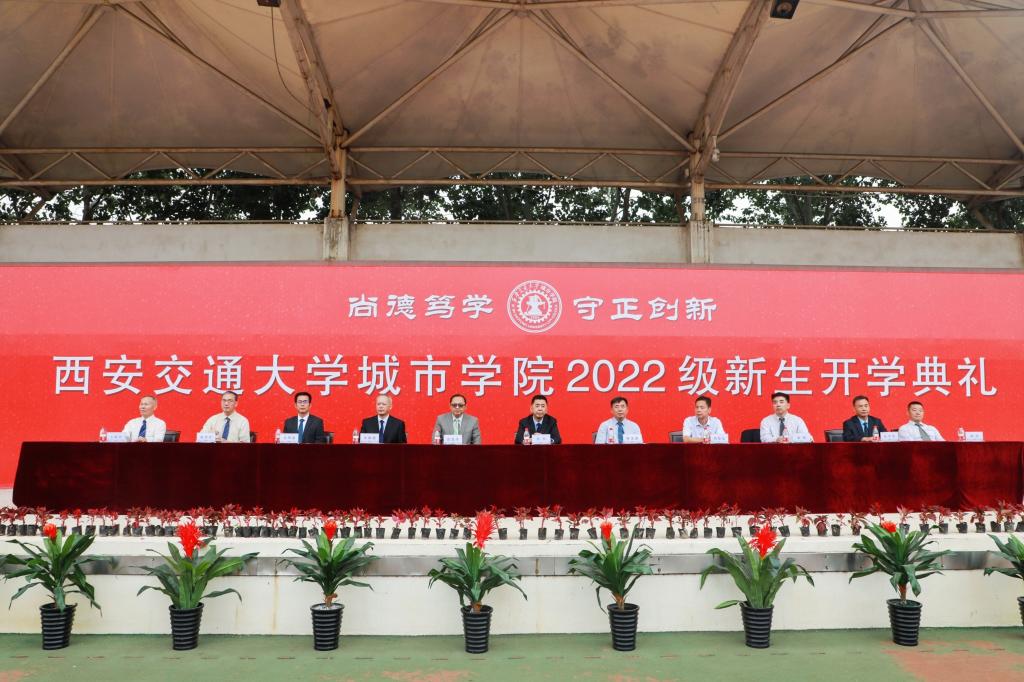 恰同学少年,风华正茂。9月17日上午,西安交通大学城市学院在田径运动场举行2022级新生开学典礼。2022级新同学在老师、同学、学长学姐的祝福声中,怀揣梦想,以昂扬奋斗的青春姿态,共同开启城院时光。西安交通大学党委常委、校长助理洪军,西安交通大学社会教育管理处副处长巩稳定,西安交通大学城市学院院长陈光德,党委书记张爱萍,副院长张敬朝,副院长朱旭,副院长岳华海,院长助理张学堂,纪委书记朱普社,工会主席冀祥、教授会主席王海民等出席大会并在主席台就座。大会由路凡同学主持。