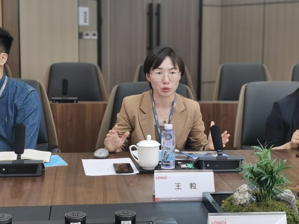 王粒总监首先对张爱萍书记一行的到来表示热烈欢迎,并介绍了公司的基本情况、发展理念、科学研究、行业规模和校招情况。她表示,基于碳中和背景下的能源转型与国家能源结构调整,企业迫切需要在光伏专业共建、人才定向培养、订单班等方面与高校开展广泛的合作,希望双方能够以此交流为契机,共同构建长期有效的机制,持续推进双方交流与合作向更深层次发展。