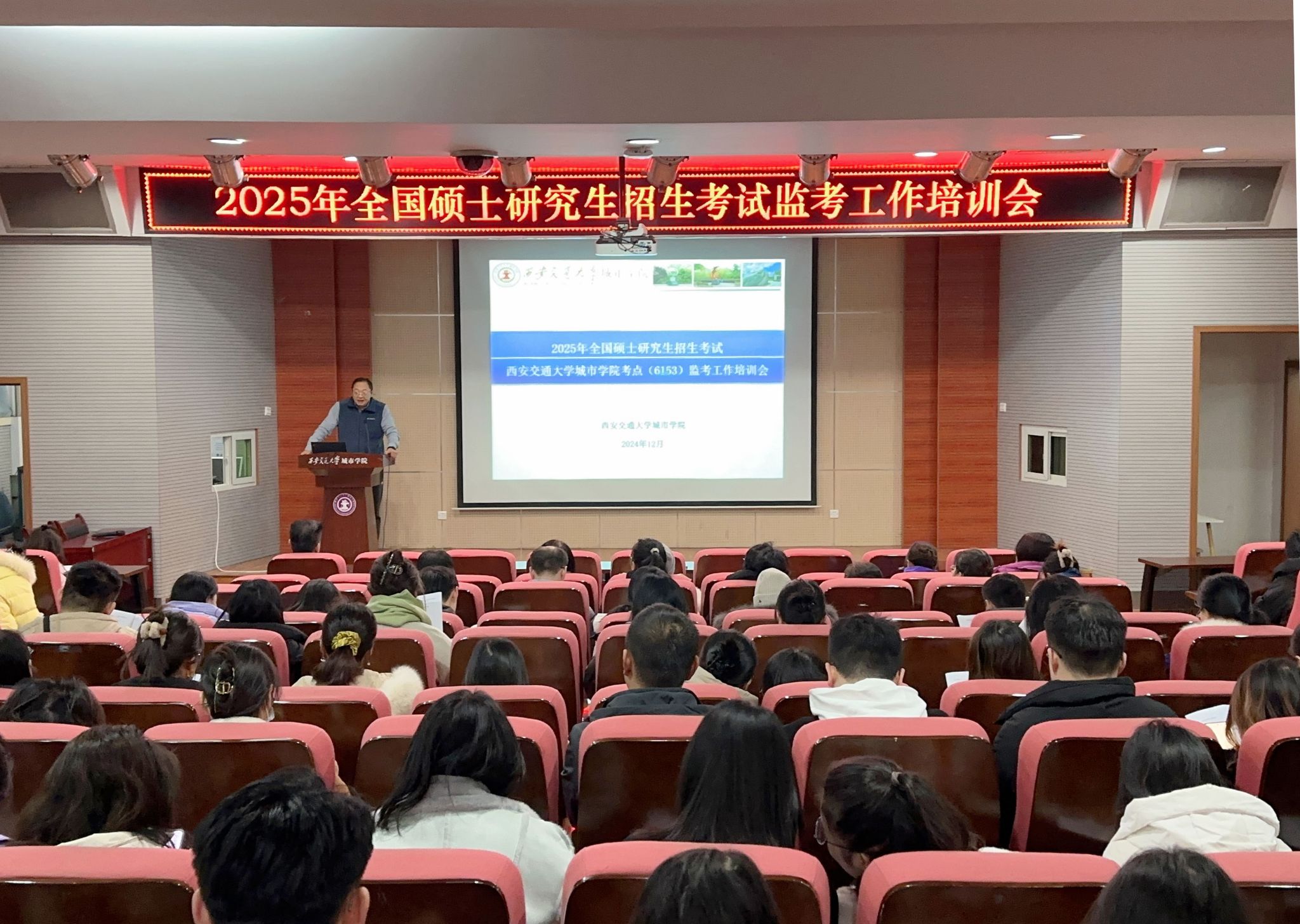 为全面做好学校2025年全国硕士研究生招生考试工作,进一步提高认识、加强领导、强化工作措施,确保研考各项工作圆满完成,12月20日上午,西安交通大学城市学院在F100报告厅举办2025年全国硕士研究生招生考试监考培训会,党委书记张爱萍、副校长朱旭、教学科研部副部长袁晓蕾,全体监考教师、考务工作人员参加会议,会议由副校长朱旭主持。