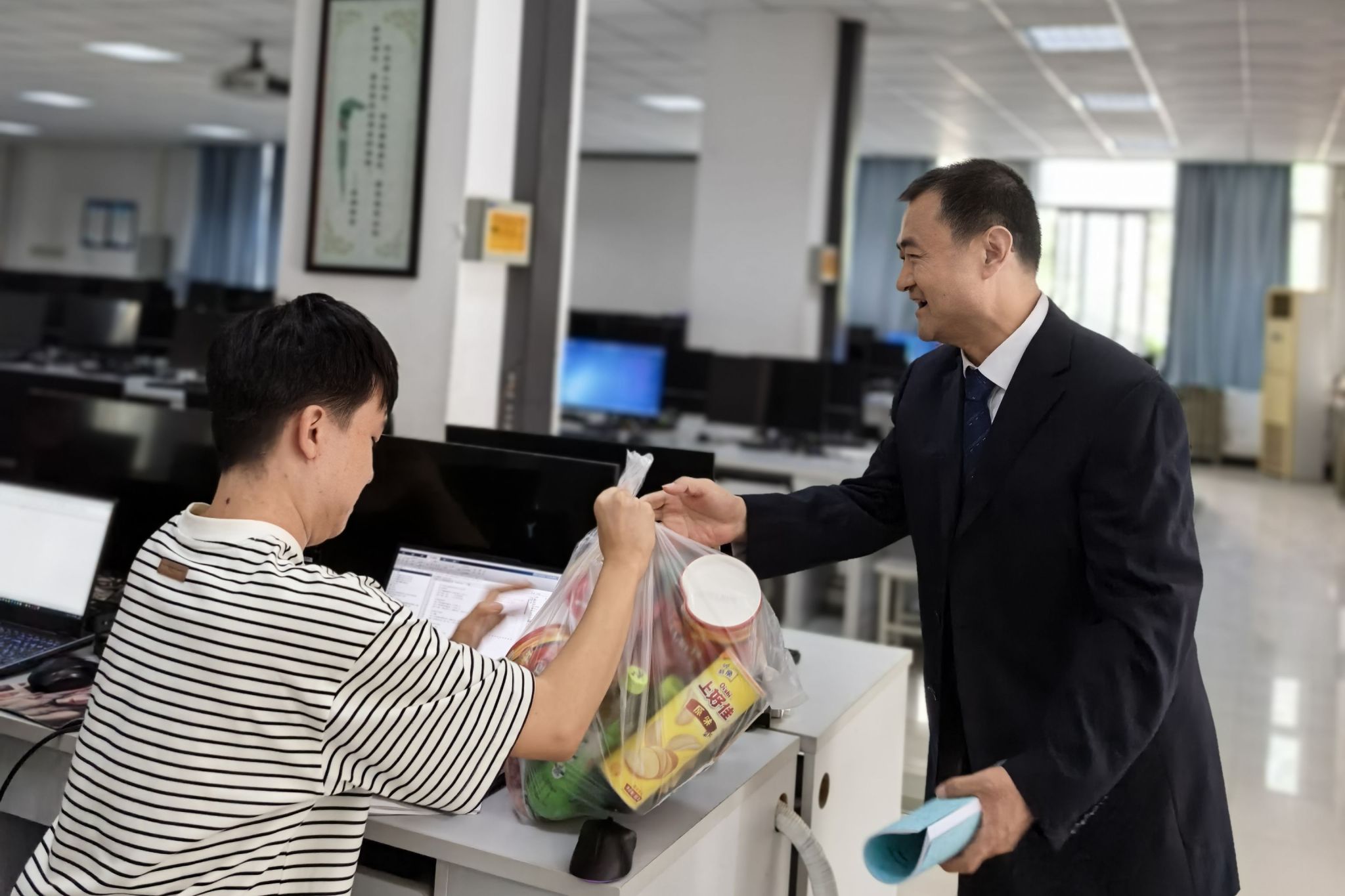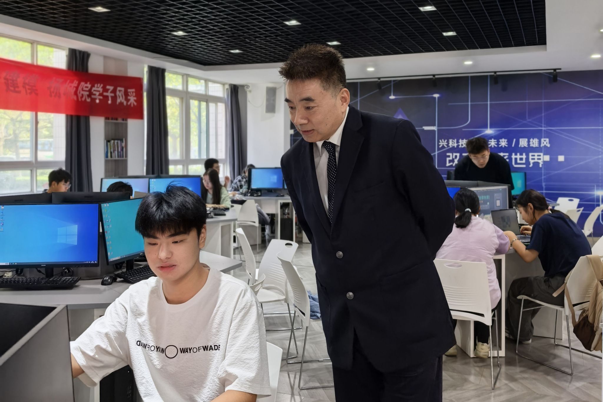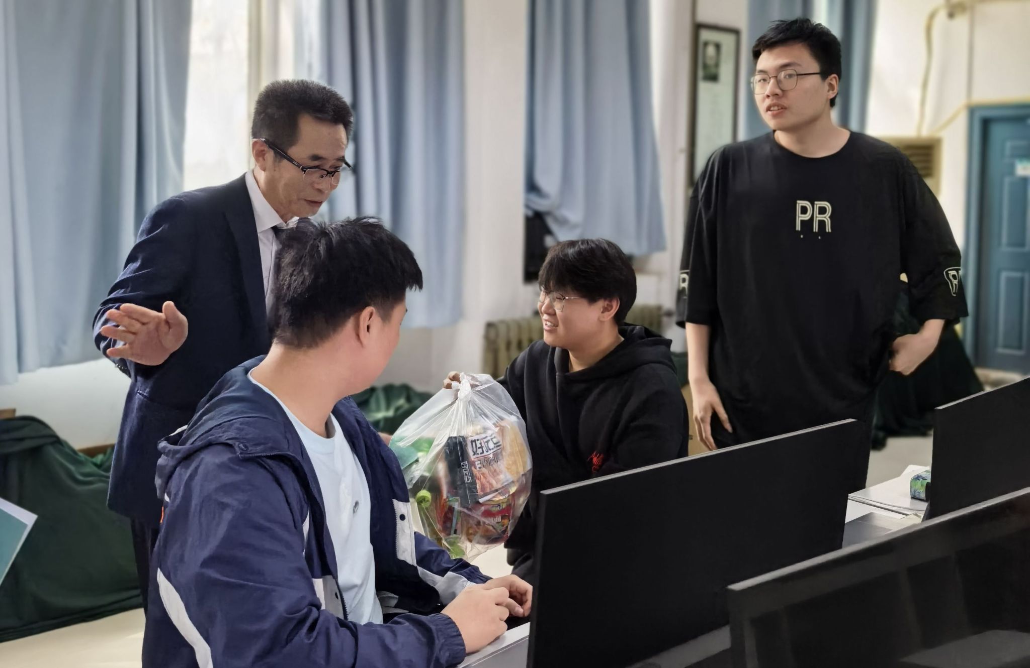 校领导细致查看竞赛环境和条件,详细了解竞赛组织、服务保障等方面的工作,并向参赛师生发放慰问品。他们与同学们亲切交流,赞扬大家全力以赴、积极备赛的精神风貌,鼓励同学们坚定信心、沉着应战,充分发挥所学知识和团队协作能力,精益求精,争取优异成绩,为学校赢得荣誉。