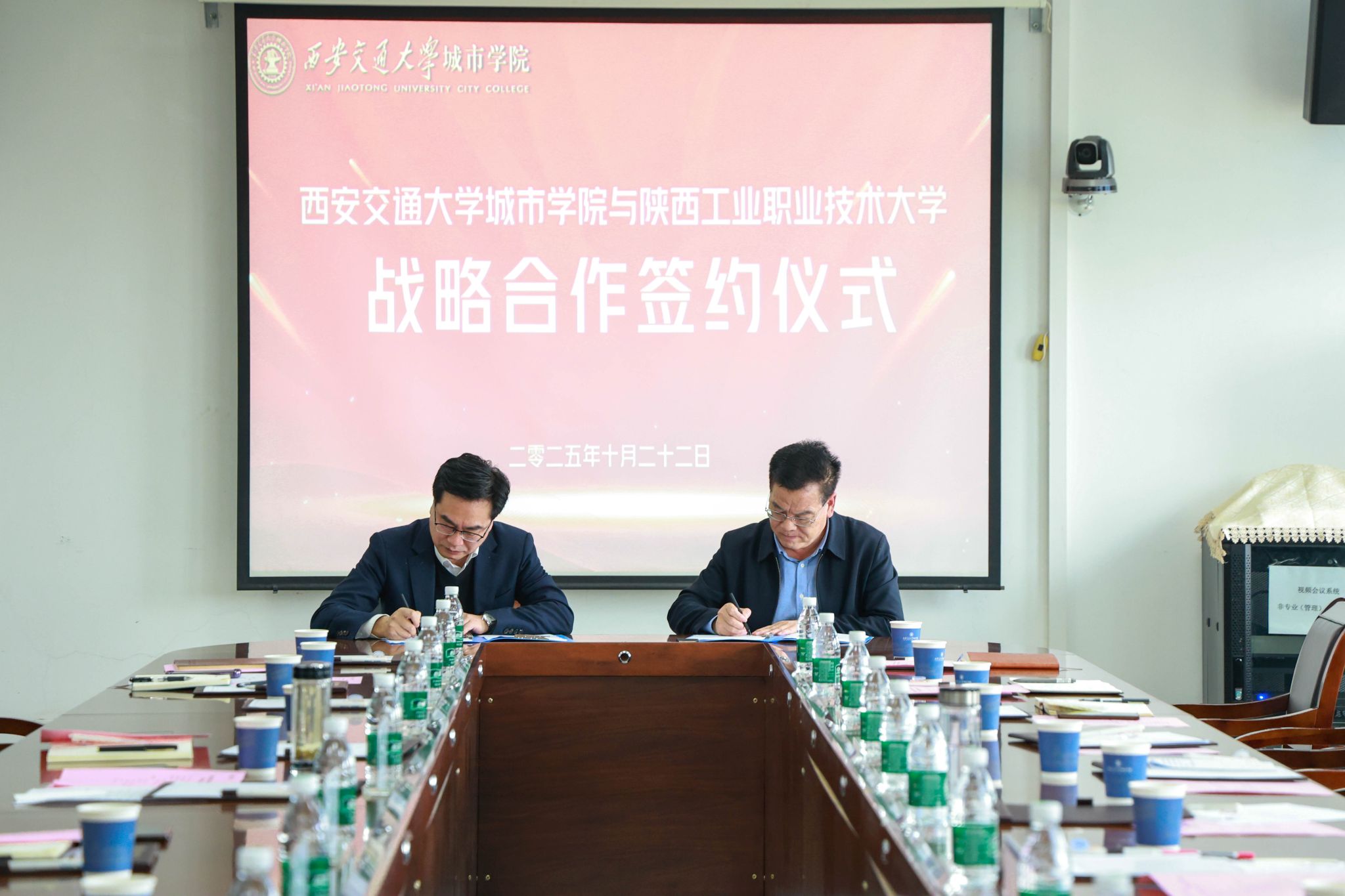 10月22日,陕西工业职业技术大学党委副书记、校长刘永亮一行来校交流并签署战略合作协议。西安交大城市学院校长王永泉,副校长朱旭,校长助理、行政人事部部长姬志国,党委工作部、教学科研部、行政人事部及相关二级学院负责人参加会见。