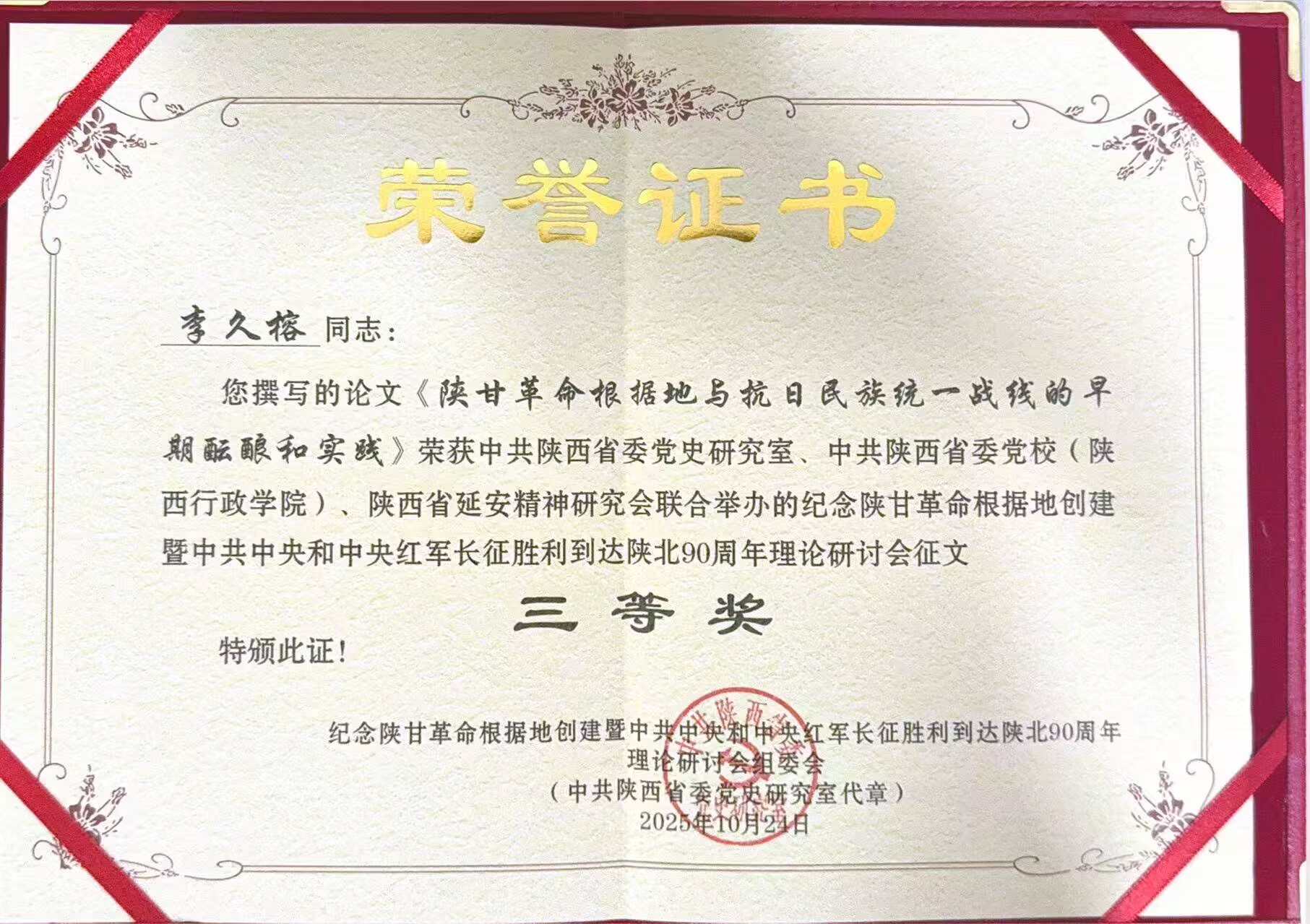 10月24日,由中共陕西省委党史研究室、中共陕西省委党校(陕西行政学院)、陕西省延安精神研究会联合举办的纪念陕甘革命根据地创建暨中共中央和中央红军长征胜利到达陕北90周年理论研讨会召开。在此次会议的征文评选中,西安交通大学城市学院辅导员李久榕撰写的《陕甘革命根据地与抗日民族统一战线的早期酝酿和实践》论文获三等奖。