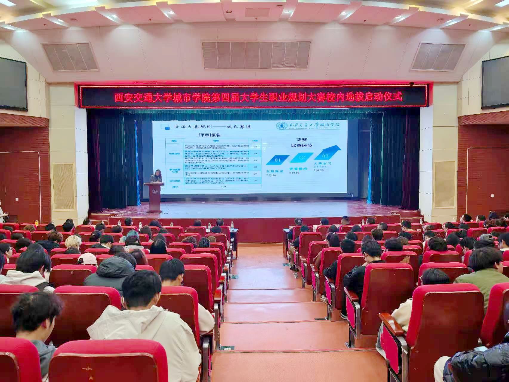 为贯彻落实党中央、国务院和省委、省政府关于高校毕业生就业工作的决策部署,强化学校生涯教育和就业指导,增强学生职业规划意识,指导其通过学习实践提升综合素质和能力,及早做好就业准备,以择业新观念打开就业新天地,促进高质量充分就业,11月14日,西安交通大学城市学院在教二报告厅举办第四届大学生职业规划大赛暨第三届陕西省大学生职业规划大赛校内选拔赛启动仪式。党委副书记、副校长陈书荣,学生工作处处长辛红伟,招生就业处处长成琳、副处长吴昊翔及各二级学院学生工作负责人、辅导员参加活动。本次活动特邀请西北工业大学数学与统计学院党委书记王莉作专题辅导报告。