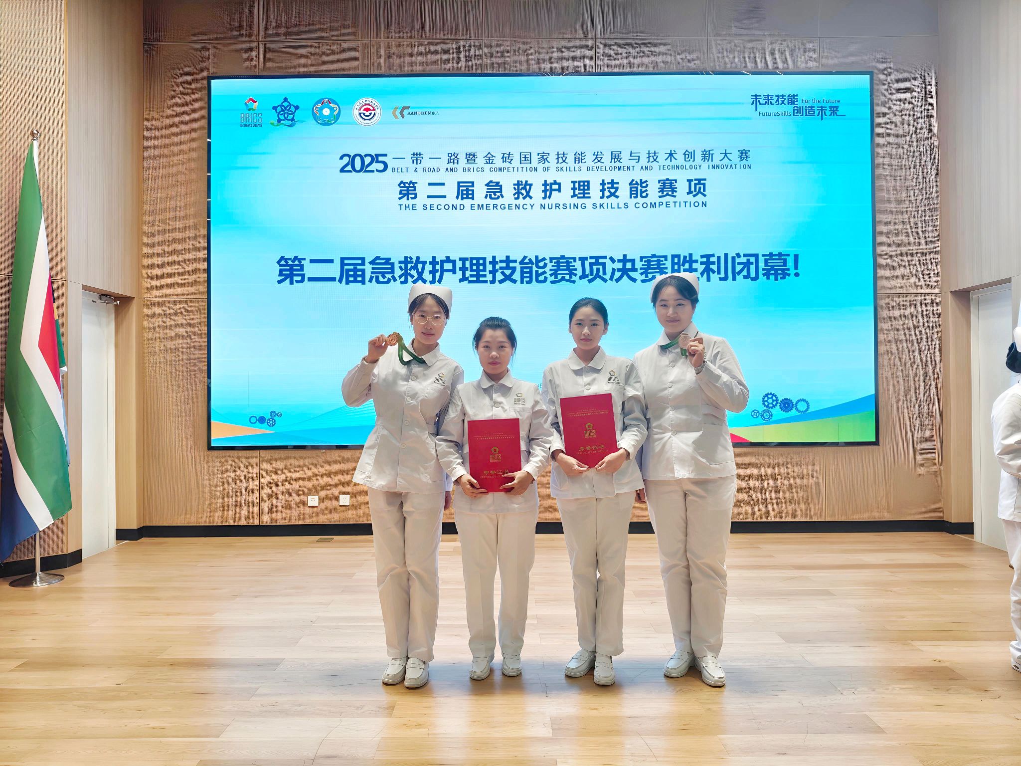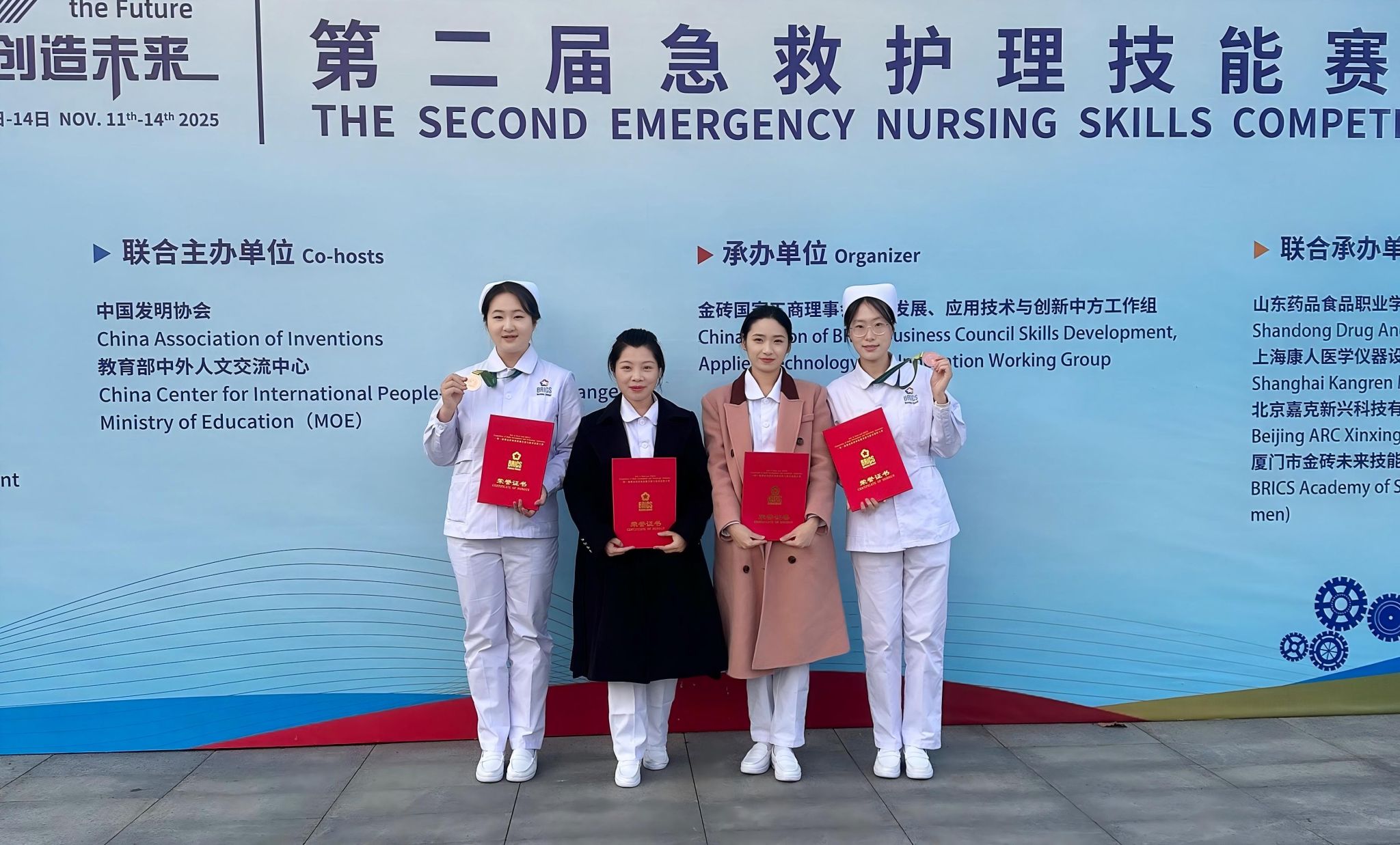 11月11日至14日,2025一带一路暨金砖国家技能发展与技术创新大赛第二届急救护理技能赛项全国总决赛在山东威海举办。大赛设立中职组、高职组、本科组及教师组四个赛道,汇聚了来自全国91所院校的120余支参赛队伍同台竞技,全面展示护理人才的专业技能与职业风采。经过激烈角逐,我校护理与康复学院梁梦爽、卢雨悦两名同学凭借扎实的专业基础、规范的操作技能与出色的临场应变能力,在众多参赛选手中脱颖而出,最终荣获本科组三等奖,丁文秀、车璐获教师组优秀奖。