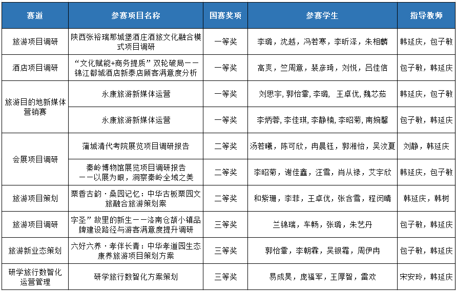 近日,第十九届全国高校商业精英挑战赛文旅与会展创新创业实践竞赛公布获奖结果。在全国总决赛中,我校获得一等奖4项、二等奖3项、三等奖3项,学校获得最佳院校组织奖。在陕西省赛中,获得一等奖6项,二等奖1项,三等奖3项。