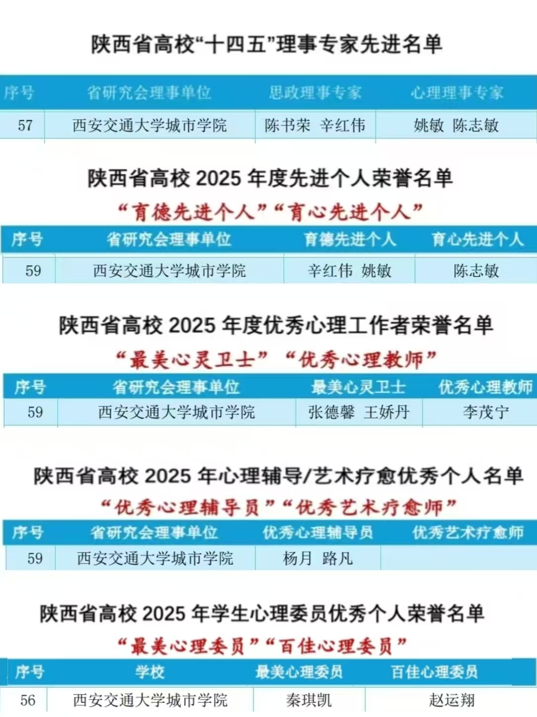 在本次评选中,我校党委副书记、副校长陈书荣,学生工作处处长辛红伟获评陕西省高校“十四五”思政理事专家,学生工作处副处长姚敏、心理中心教师陈志敏获评心理理事专家。同时,辛红伟、姚敏获“育德先进个人”称号,陈志敏获“育心先进个人”称号;辅导员王娇丹、张德馨获“最美心灵卫士”称号;通识教育学院李茂宁被评为优秀心理教师;辅导员杨月、路凡获评优秀心理辅导员。艺术学院环境设计2402班秦琪凯同学获“最美心理委员”称号,经济与管理学院会计2401班赵运翔同学获评“百佳心理委员”。