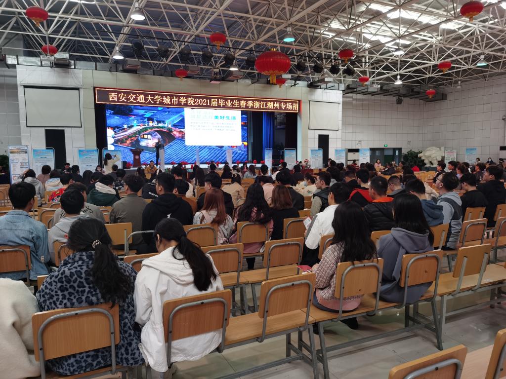 为拓宽西安交通大学城市学院毕业生就业渠道,3月25日,学院特举办2021年浙江湖州专场地区类招聘会。湖州市委宣传部文化发展改革处处长陆孙杰,湖州市人力社保局李文华科长等领导带队,带领30余家文化传媒类优质企业来我院选聘毕业生。