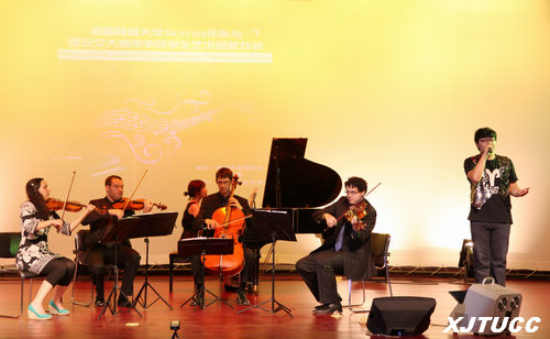 Cellist William Braun, Violist Justin Kurys, Violinists James Moat and Sarah Pizzichemi and Pianist April Sun played Out of Doors, Piano Sonata No. 2, A single Bamboo Can Easily Bend and Piano Quintet. XJTUCC’s Art Troupe played a Saxophone Duet of My Heart Will Go On and gave a performance of traditional Chinese musical instruments. The performance ended with a choral rendition of Swan Goose.