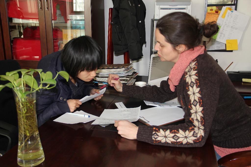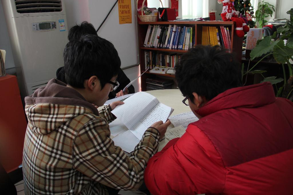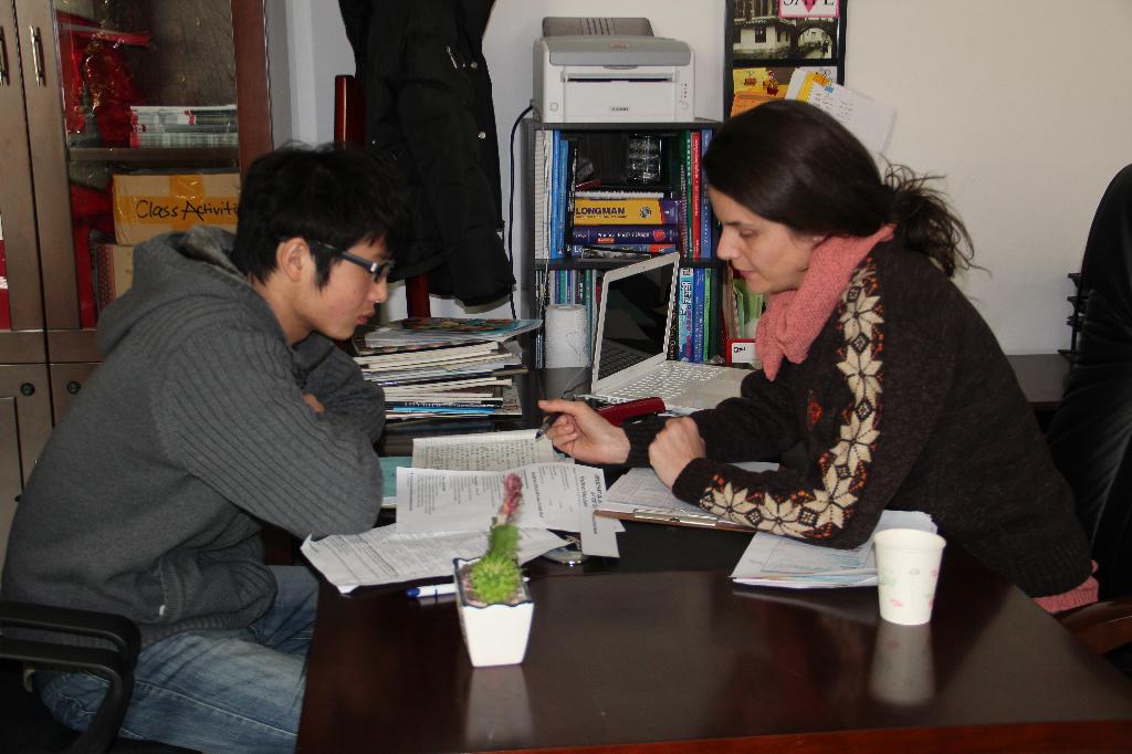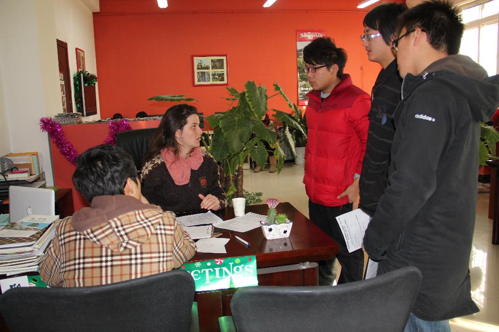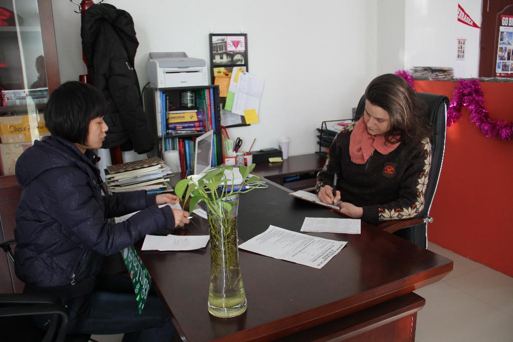 考试按正规雅思考试的形式一对一的进行。每一位同学在Mariah事先准备好的话题中抽取一个,并就该话题发表自己的看法。然后Mariah会就他们所说的内容提问。最后她会根据学生的表现指出他们各自所存在的问题,如错误发音和文化方面的误解,并就这些问题提出建议。