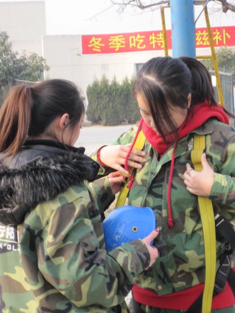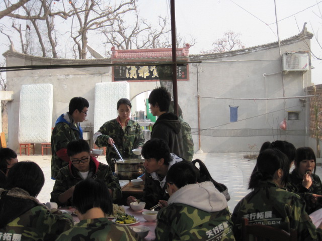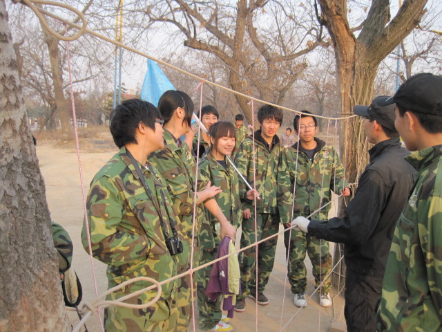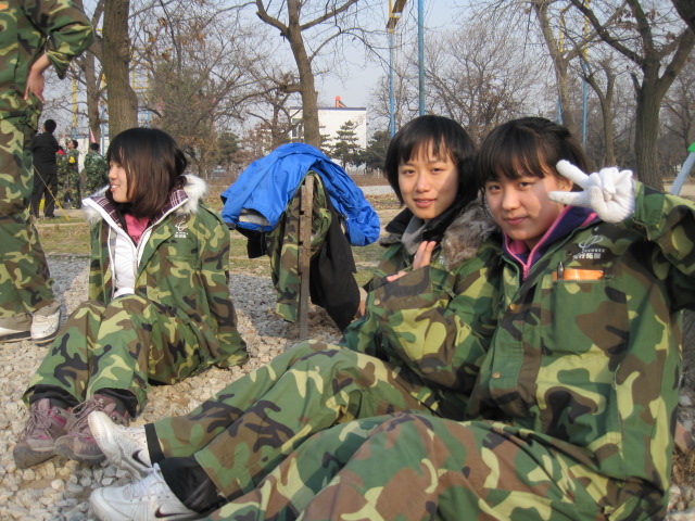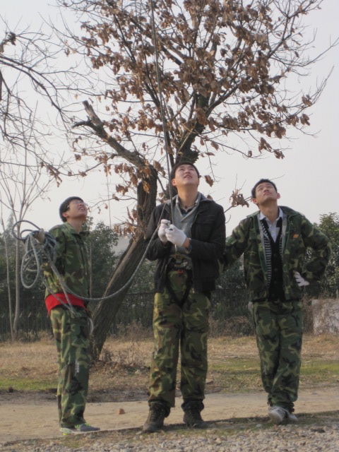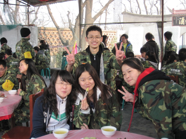 12日早晨7点多,天色还很朦胧,大家便在校门口集合。虽然冬天的温度很低,大家看起来却异常兴奋,显然对这次的训练非常期待。一个多小时的车程后我们到达了目的地。在教官的带领下我们领取了服装,然后来到了举行开营仪式的地方。在这里,我们先做了几个小游戏,大家都被逗得哈哈大笑,同学间原有的拘谨没有了,气氛于是活跃了起来。然后,我们被分成了四个小组,并在十分钟内选出了队长,画出了队徽,想出了队歌及口号。