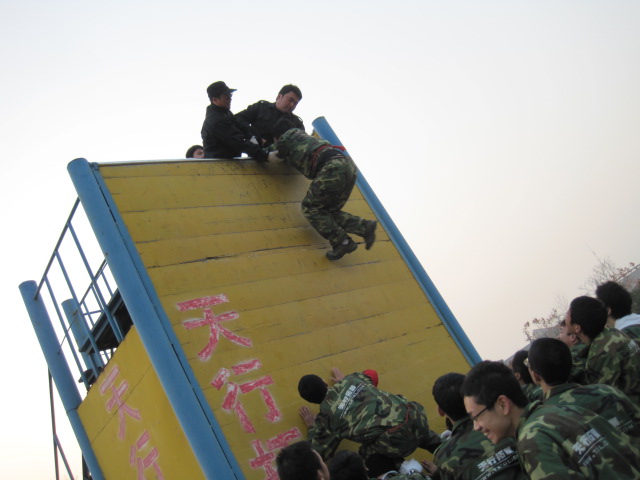 短暂的休息后,我们又回到了训练场地继续训练。因为经过了上午的训练,下午的训练便不像原来那样使人胆战心惊了,同学们互助互爱,团结一致,非常顺利地完成了一天的训练。当项目内所有同学登上毕业墙,获得拓展训练的证书,大家深深拥抱队友,不经意间泪水滑落。