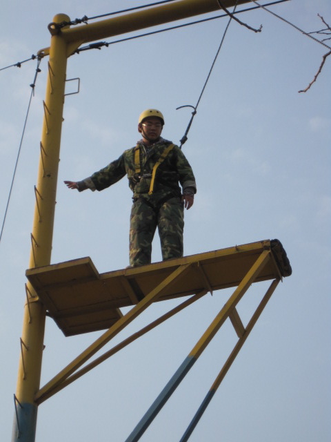 开营仪式结束后,我们来到了训练基地。经过教官详尽的的安全知识讲解后,四个小组被各自负责的教官带到了训练项目前开始了训练。训练项目包括高空项目和地上项目。高空项目包括断桥、八字桥、独木桥、钢索及平行桥等项目;地面项目则包括木屐、电网、乒乓接龙、绝壁求生等项目。首先便是高空项目,看着那悬挂在8米高空的任务,同学们都不禁有些担心:自己能顺利完成任务吗?但大家还是镇定的跟随着教官的指引认真的做了起来:一些人上去完成任务,一些人担当保护人员,还有一些人为他们呐喊助威,一切都井井有条。碰到胆小的同学,大家就齐声地鼓励安慰他们,直到每个人都顺利完成任务。上午的时光很快就过去,十二半点左右,大家重新集合在一起准备吃饭,以便养足精神下午继续战斗。