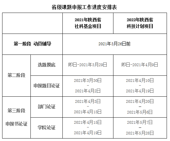往年陕西省社会科学基金系统填报时间为3月中旬至4月底,陕西省科技计划项目系统填报时间为7月至8月初。以上各阶段时间安排(见下表)为预估时间,待正式申报通知发布后如有时间调整会及时通知各部门老师,请各部门先按预估时间组织申报工作。