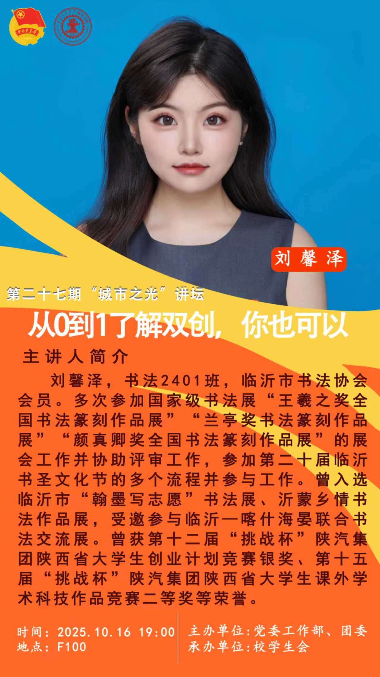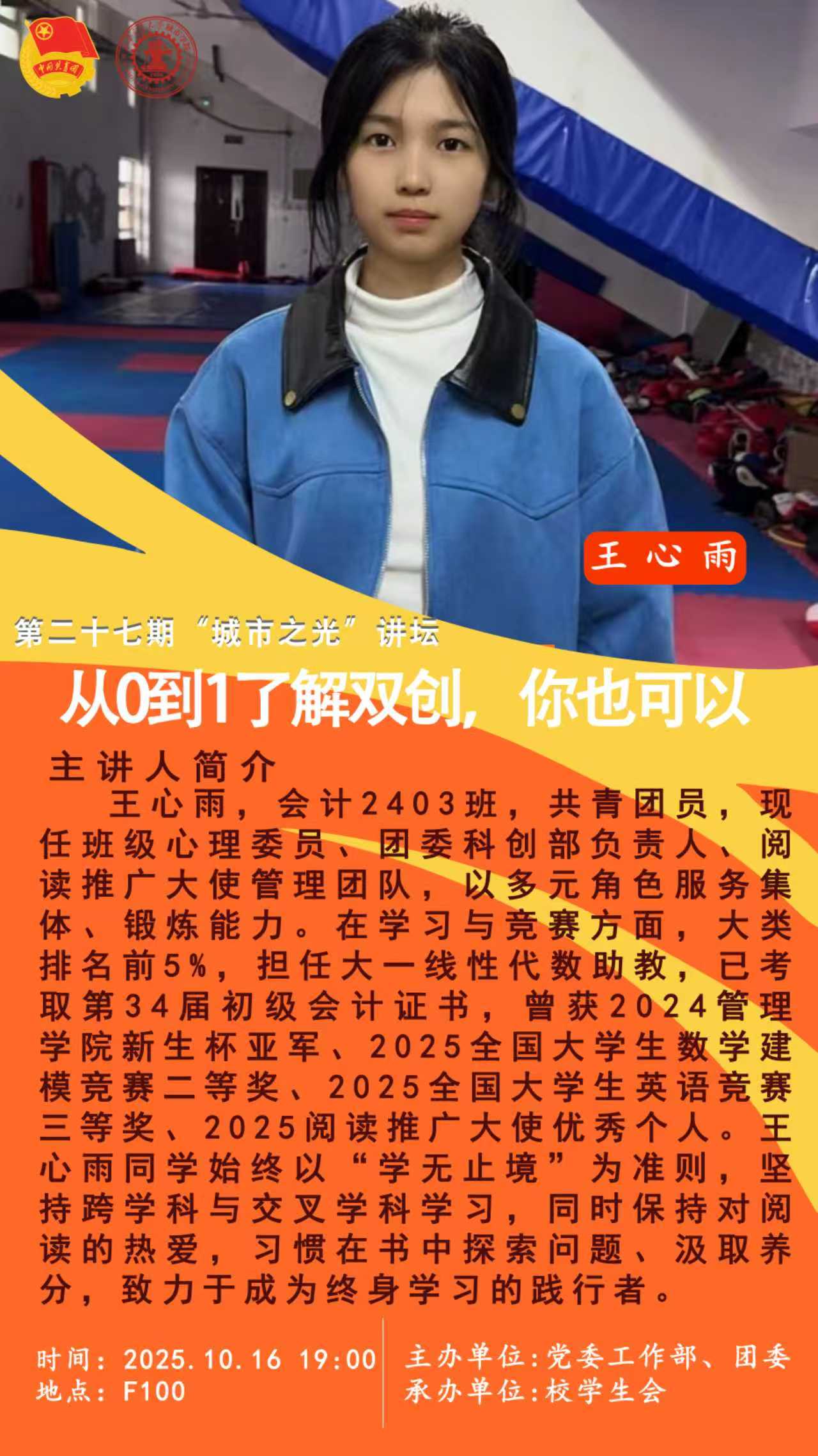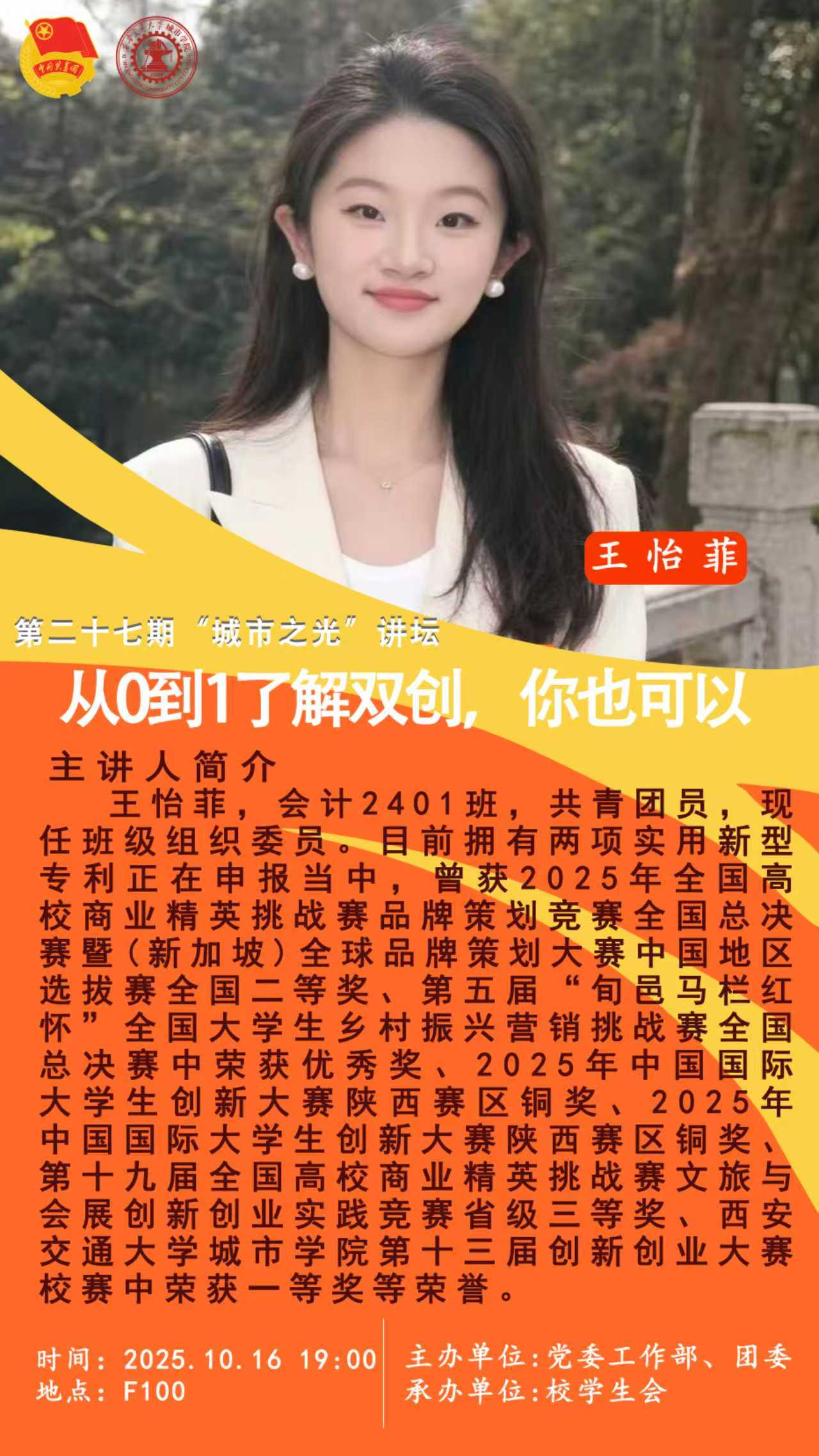 讲座内容概要:本期“城市之光”讲坛特邀在“挑战杯”“国创”顶级双创赛事中斩获佳绩的校园科创之星,与你面对面分享他们的“从0到1”之路。主讲人将结合自身获奖项目实例,分享如何从日常学习与生活中发掘有价值的课题,以及在漫长的备赛过程中如何平衡学业、克服困难、实现突破的实战经验与心路历程。