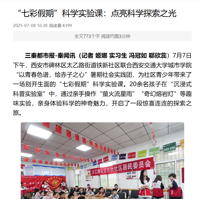 7月7日下午,西安市碑林区太乙路街道铁新社区联合西安交通大学城市学院“以青春色谱,绘赤子之心”暑期社会实践团,为社区青少年带来了一场别开生面的“七彩假期”科学实验课。20余名孩子在“沉浸式科普实验室”中,通过亲手操作“萤火流星雨”“奇幻熔岩灯”等趣味实验,亲身体验科学的神奇魅力,开启了一段惊喜连连的探索之旅。