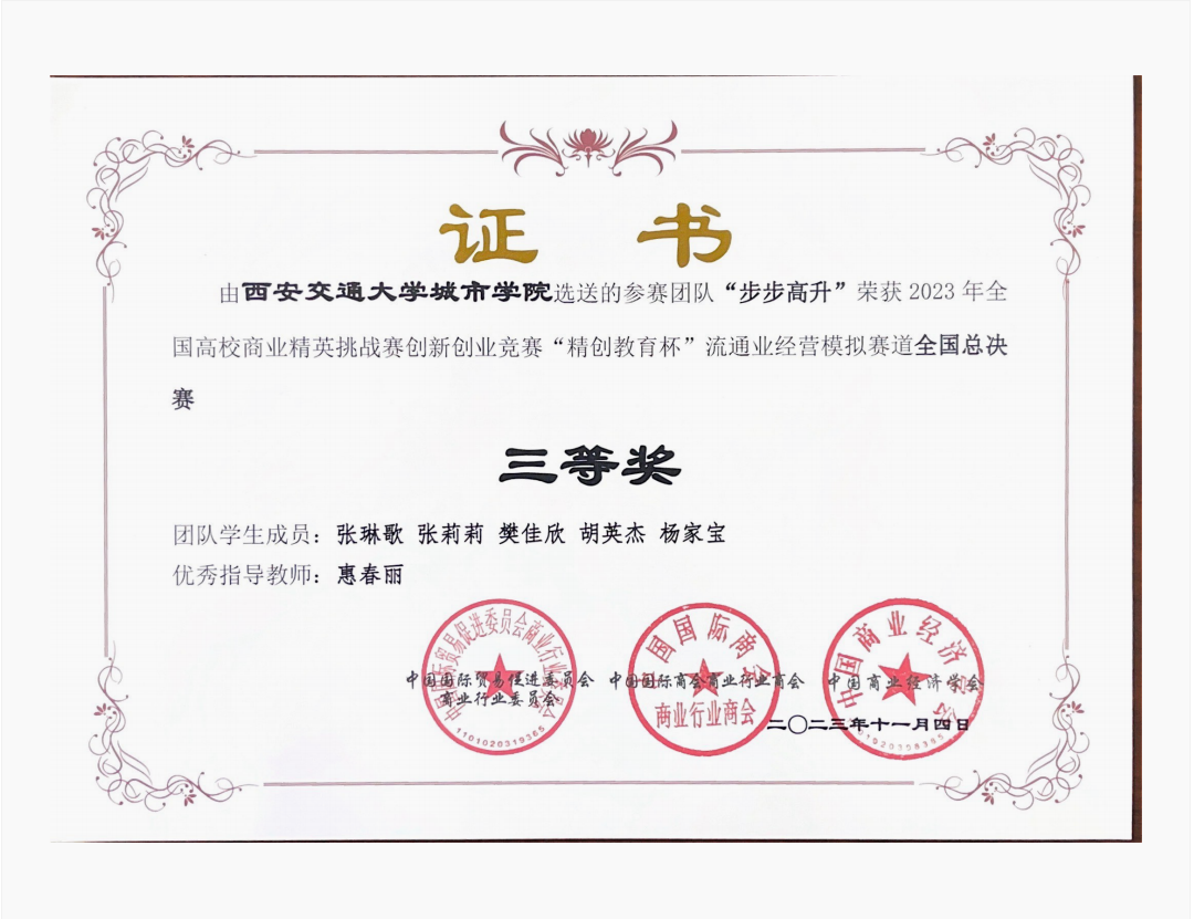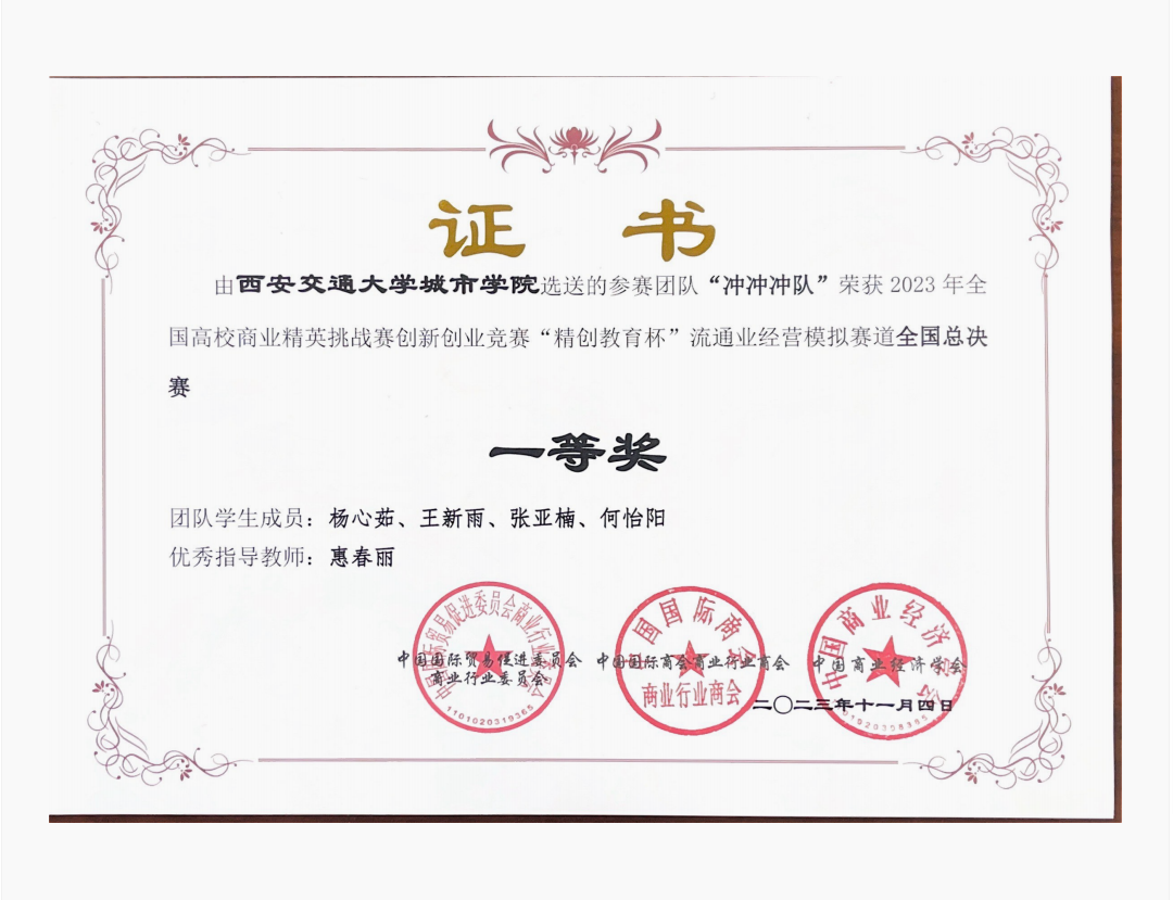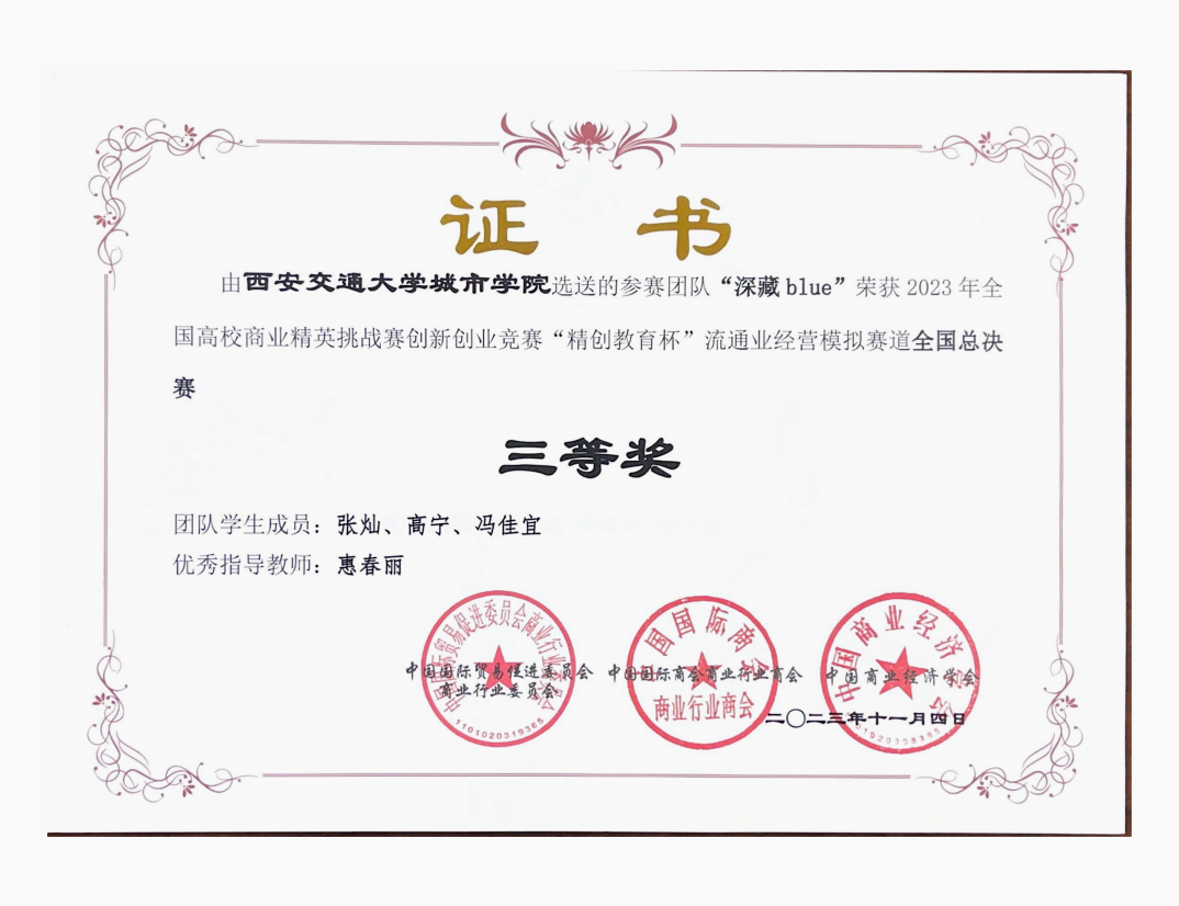 2023年5月竞赛启动以后,管理系充分动员,精心组织,历经知识赛、校赛、区域赛等环节,三支队伍获得全国总决赛资格。总决赛以《流通业经营模拟竞赛对抗平台》为模拟平台,参赛团队通过市场调研、市场开拓、供应商选择与采购管理、产品运输、仓储管理、销售渠道运营与促销、产品配送、产品销售与售后服务等流程模拟一家商贸流通企业的运营过程。经过一天四个环节的比拼,学校参赛的三支队伍,获得全国一等奖一项,全国三等奖两项,是学校自参加此项竞赛以来取得的最好成绩。