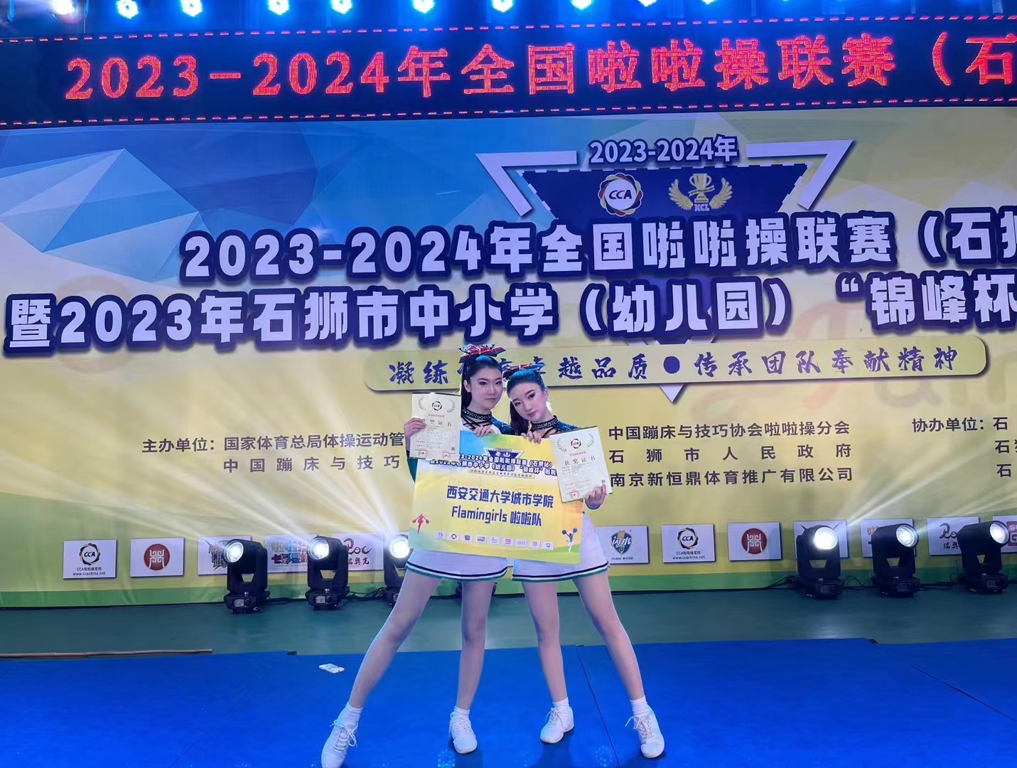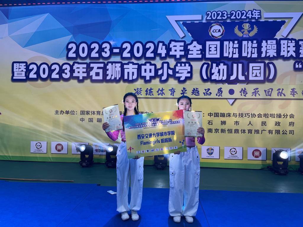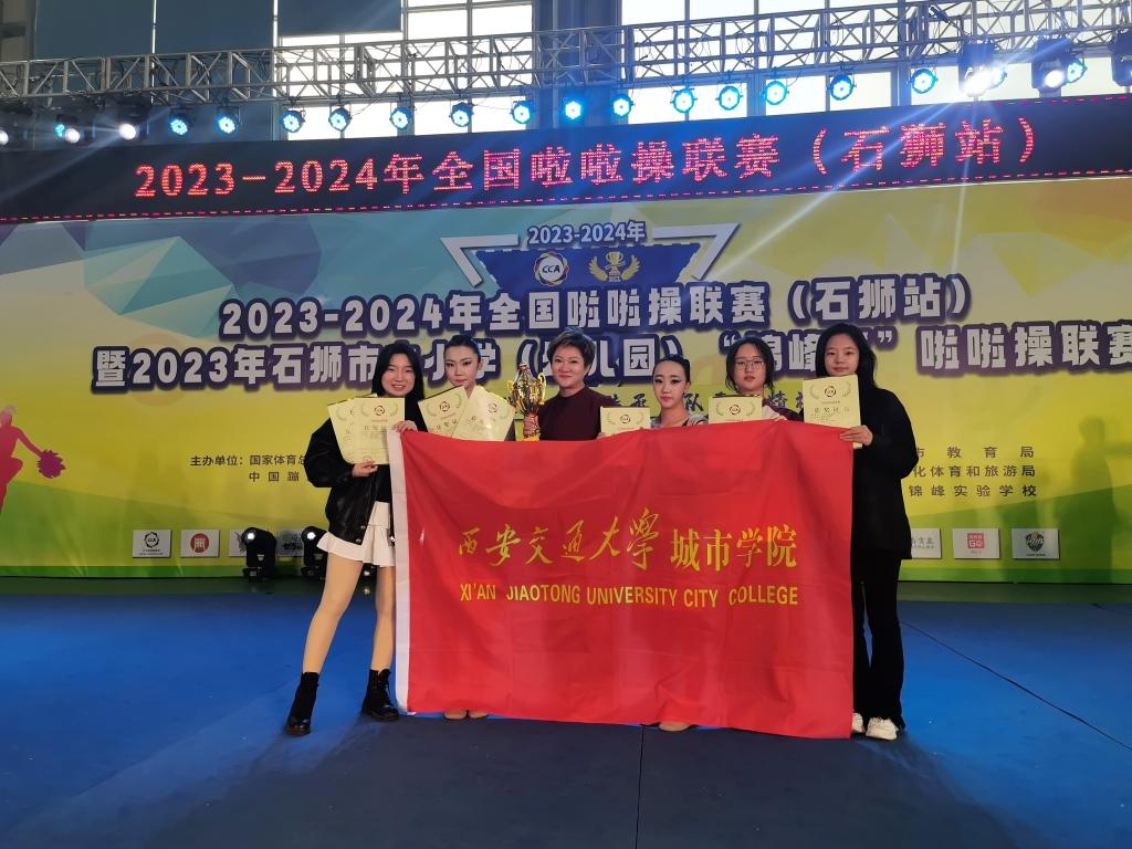 “2023-2024年全国啦啦操联赛”(石狮站)于11月17日—20日在福建省石狮市举行。西安交通大学城市学院啦啦操队管理系许一凡、林斯南同学获得爵士双人自选套路第一名,管理系许一凡、吴梦瑶同学获得花球双人自选套路第二名,计算机系李欣洁、刘飘飘同学获得街舞双人自选套路第四名优异成绩。
