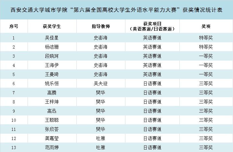 近日,第六届全国高校大学生外语水平能力大赛落下帷幕,外语系学生共13人获奖,其中参加英语赛道的吴佳星、杨洁珊荣获特等奖,王海伊等3人荣获一等奖;参加日语赛道的姚乐恒等8人荣获三等奖;外语系教师史澎海、吴夫迎、樊华、吐雅荣获“优秀指导老师奖”,西安交通大学城市学院荣获“最佳院校组织奖”。