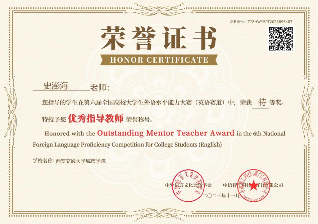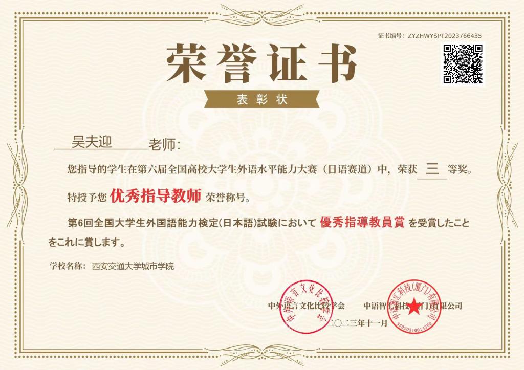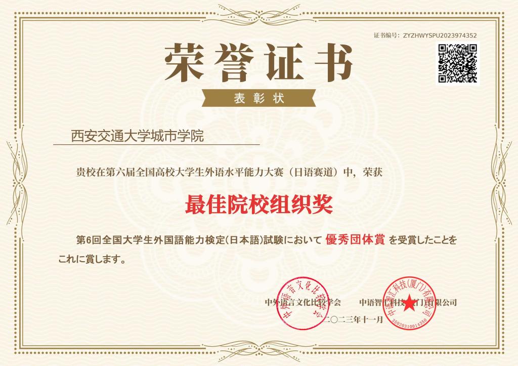 近日,第六届全国高校大学生外语水平能力大赛落下帷幕,外语系学生共13人获奖,其中参加英语赛道的吴佳星、杨洁珊荣获特等奖,王海伊等3人荣获一等奖;参加日语赛道的姚乐恒等8人荣获三等奖;外语系教师史澎海、吴夫迎、樊华、吐雅荣获“优秀指导老师奖”,西安交通大学城市学院荣获“最佳院校组织奖”。