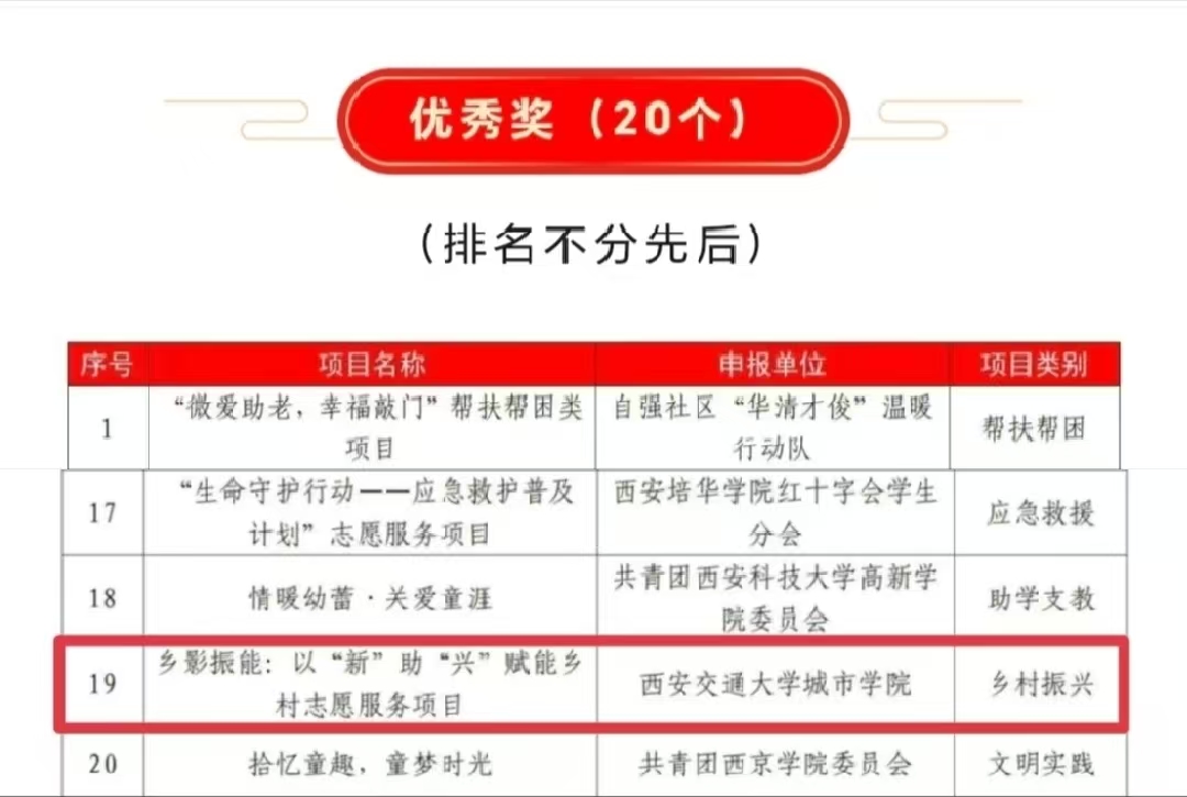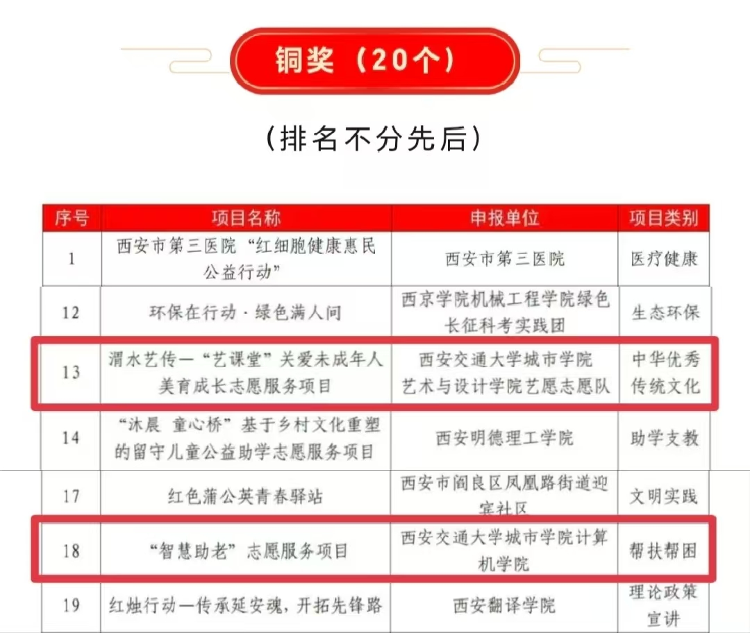 近日,西安市第二届青年志愿服务项目大赛终评落下帷幕,学校申报的项目多项荣誉,其中艺术与设计学院艺愿志愿队《渭水艺传——“艺课堂”关爱未成年人美育成长志愿服务项目》获铜奖,计算机学院《“智慧助老”志愿服务项目》获铜奖,校团委《乡影振能:以“新”助“兴”赋能乡村志愿服务项目》获优秀奖。